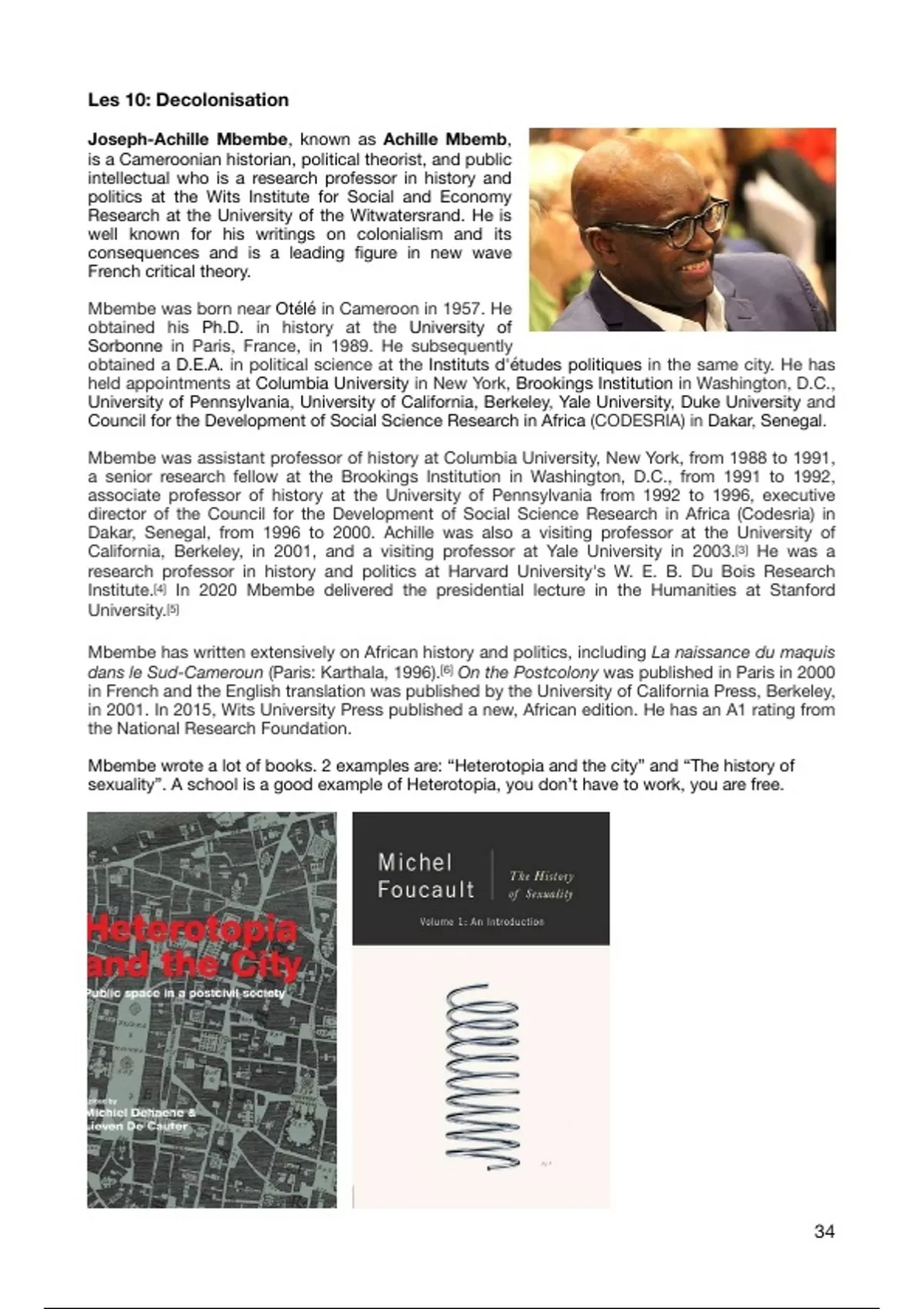 Mbembe wrote a lot of books. 2 examples are: “Heterotopia and the city” and “The history of