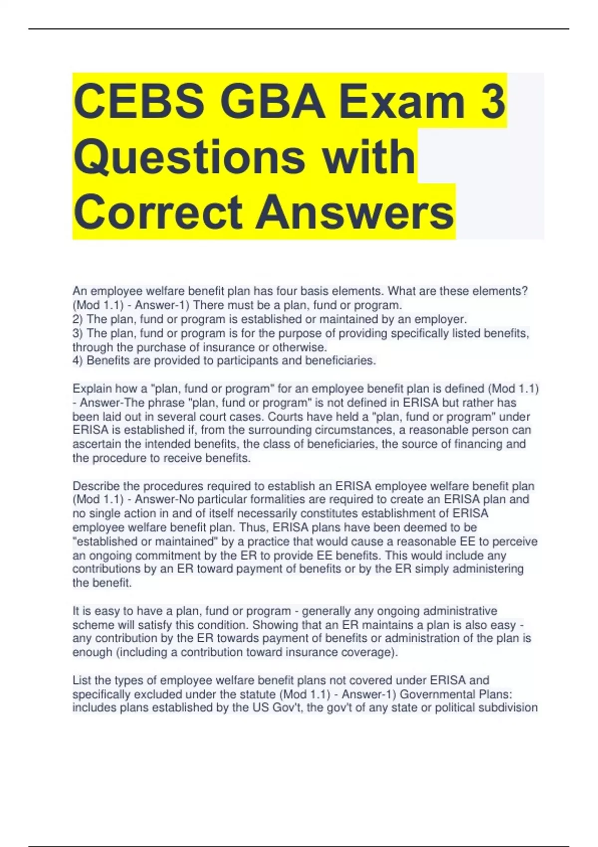 CEBS GBA Exam 3 Questions with Correct Answers An employee welfare benefit plan has four basis elements. What are these elements? (Mod 1.1) - Answer-1) There must be a plan, fund or program. 2) The plan, fund or program is established or maintained by an employer. 3) The plan, fund or program is for the purpose of providing specifically listed benefits, through the purchase of insurance or otherwise. 4) Benefits are provided to participants and beneficiaries. Explain how a "plan, fund or program" for an employee benefit plan is defined (Mod 1.1) - Answer-The phrase "plan, fund or program" is not defined in ERISA but rather has been laid out in several court cases. Courts have held a "plan, fund or program" under ERISA is established if, from the surrounding circumstances, a reasonable person can ascertain the intended benefits, the class of beneficiaries, the source of financing and the procedure to receive benefits. Describe the procedures required to establish an ERISA employee welfare benefit plan (Mod 1.1) - Answer-No particular formalities are required to create an ERISA plan and no single action in and of itself necessarily constitutes establishment of ERISA employee welfare benefit plan. Thus, ERISA plans have been deemed to be "established or maintained" by a practice that would cause a reasonable EE to perceive an ongoing commitment by the ER to provide EE benefits. This would include any contributions by an ER toward payment of benefits or by the ER simply administering the benefit. It is easy to have a plan, fund or program - generally any ongoing administrative scheme will satisfy this condition. Showing that an ER maintains a plan is also easy - any contribution by the ER towards payment of benefits or administration of the plan is enough (including a contribution toward insurance coverage). List the types of employee welfare benefit plans not covered under ERISA and specifically excluded under the statute (Mod 1.1) - Answer-1) Governmental Plans: includes plans established by the US Gov't, the gov't of any state or political subdivision and any agency of any of the foregoing or a plan to which the Railroad Retirement Act applies, as well as certain plans associated with Native American Tribal gov'ts. 2) Church plans: a plan established and maintained for its EE's by a church or by a convention or association of churches is exempt from tax under IRC Sec 501. 3) A plan maintained to comply with state laws on Worker's Comp, Unemployment or Mandated Disability Insurance. 4) A plan maintained outside the US primarily for nonresident aliens. 5) Plans that cover only self-employed individuals and that cover no "common-law employees" generally not subject to ERISA. 6) Plans that cover only married shareholders of a corporation are not treated as ERISA plans. ER should be aware that is may be required to comply with other federal laws that affect EE benefit plans. List the types of benefits provided by ERISA health and welfare, and provide examples of such plans (Mod 1.1) - Answer-a) Medical, Surgical or Hospital Care or Benefits b) Benefits in the event of sickness, accident, disability, death or unemployment c) Vacation Benefits d) Apprenticeship or other training benefits e) Day-care centers f) Scholarship funds g) Prepaid legal services Ex: Medical Insurance, Dental, Vision, Prescription Drug Plans, Drug or Alcohol Treatment programs, FSAs, EAPs, Wellness Programs, AD&D and STD/LTD Plans. Discuss whether plans that involve payroll practices are treated as ERISA health and welfare plans (Mod 1.1) - Answer-The payment of an employee's normal compensation in full or in part out of the employer's general assets for periods when the employee is physically or mentally unable to work—that is, an unfunded short-term disability plan—is generally not a welfare benefit plan subject to ERISA. However, if a disability program provides more than an employee's normal compensation or is funded in any way—for example, it is provided through insurance - the program will be a welfare benefit plan subject to ERISA. The Dept of Labor (DOL) regulations list additional types of payroll practices as not being ERISA plans. These include plans where compensation is paid to an EE: a) While absent on holiday/vacation b) While absent on active military duty c) While absent for jury duty/witness d) On account of periods of time during which the EE performs little or no work while in training e) EE is relieved of duties while on sabbatical leave or while pursuing further education. For a voluntary benefit arrangement to be exempt from ERISA based on the DOL safe harbor, it must meet certain requirements, which are? (Mod 1.1) - Answer-a) No ER or EE organization contributions b) Participation is completely voluntary c) No ER consideration except for reasonable compensation and administration d) No employer endorsement Explain the meaning of the term "no employer endorsement" (Mod 1.1) - Answer-Means an ER can publicize, collect premiums, remit premiums, provide employee information to an insurance company and maintain a file on the voluntary plan. However, an employer cannot express positive normative judgment and cannot urge/encourage employee participation. The participation of the employer or employee organization should be limited to the duties specified in the regulation, none of which involve the exercise of discretionary duties. An employer hoping to rely on this exemption should also be careful not to create the impression that the benefit is part of its benefit package by, for example, including it in enrollment materials or encouraging employees to enroll. DOL warns in the final Family and Medical Leave (FMLA) regulations that if a plan is intended to be exempt from ERISA under this provision, the ER should not pay an EE's premium while the EE is on FMLA leave. Define each of the following ERISA terms: a) plan administrator/sponsor b) participant c) beneficiary (Mod 1.2) - Answer-(a) Plan admin