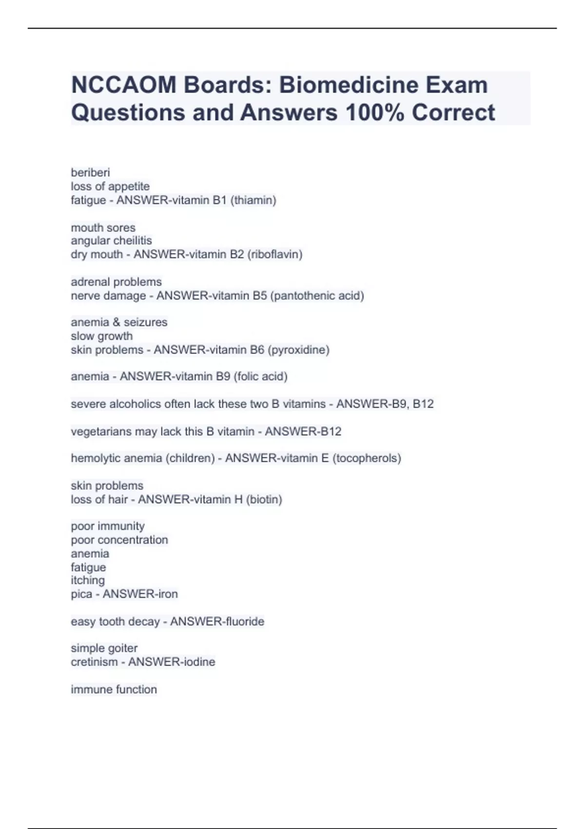 NCCAOM Boards: Biomedicine Exam Questions and Answers 100% Correct NCCAOM Boards: Biomedicine Exam Questions and Answers 100% Correct beriberi loss of appetite fatigue - ANSWER-vitamin B1 (thiamin) mouth sores angular cheilitis dry mouth - ANSWER-vitamin B2 (riboflavin) adrenal problems nerve damage - ANSWER-vitamin B5 (pantothenic acid) anemia & seizures slow growth skin problems - ANSWER-vitamin B6 (pyroxidine) anemia - ANSWER-vitamin B9 (folic acid)
