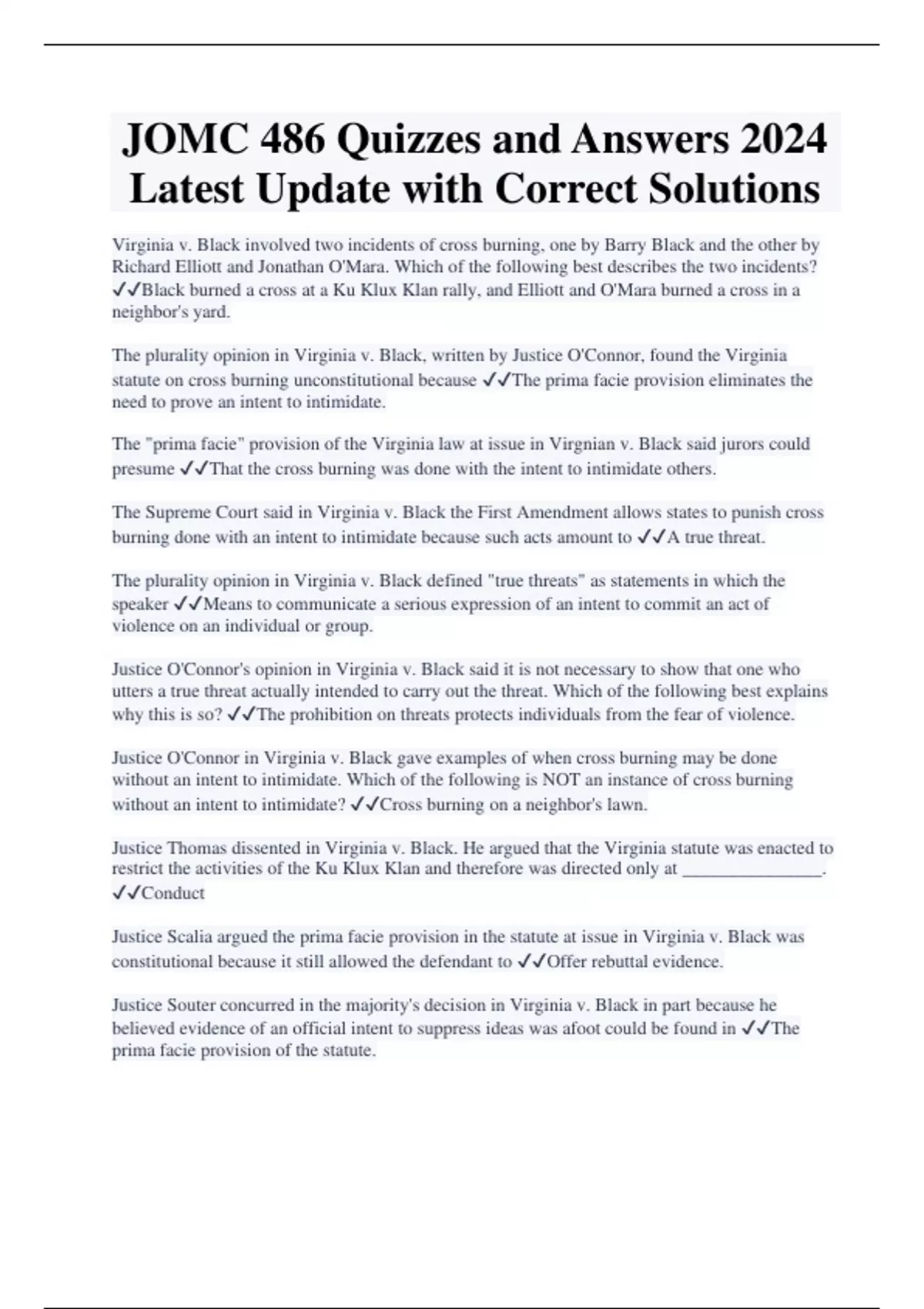 JOMC 486 Quizzes and Answers 2024 Latest Update with Correct Solutions Virginia v. Black involved two incidents of cross burning, one by Barry Black and the other by Richard Elliott and Jonathan O'Mara. Which of the following best describes the two incidents? Black burned a cross at a Ku Klux Klan rally, and Elliott and O'Mara burned a cross in a neighbor's yard. The plurality opinion in Virginia v. Black, written by Justice O'Connor, found the Virginia statute on cross burning unconstitutional because The prima facie provision eliminates the need to prove an intent to intimidate. The "prima facie" provision of the Virginia law at issue in Virgnian v. Black said jurors could presume That the cross burning was done with the intent to intimidate others. The Supreme Court said in Virginia v. Black the First Amendment allows states to punish cross burning done with an intent to intimidate because such acts amount to A true threat. The plurality opinion in Virginia v. Black defined "true threats" as statements in which the speaker Means to communicate a serious expression of an intent to commit an act of violence on an individual or group. Justice O'Connor's opinion in Virginia v. Black said it is not necessary to show that one who utters a true threat actually intended to carry out the threat. Which of the following best explains why this is so? The prohibition on threats protects individuals from the fear of violence. Justice O'Connor in Virginia v. Black gave examples of when cross burning may be done without an intent to intimidate. Which of the following is NOT an instance of cross burning without an intent to intimidate? Cross burning on a neighbor's lawn. Justice Thomas dissented in Virginia v. Black. He argued that the Virginia statute was enacted to restrict the activities of the Ku Klux Klan and therefore was directed only at _______________. Conduct Justice Scalia argued the prima facie provision in the statute at issue in Virginia v. Black was constitutional because it still allowed the defendant to Offer rebuttal evidence. Justice Souter concurred in the majority's decision in Virginia v. Black in part because he believed evidence of an official intent to suppress ideas was afoot could be found in The prima facie provision of the statute.