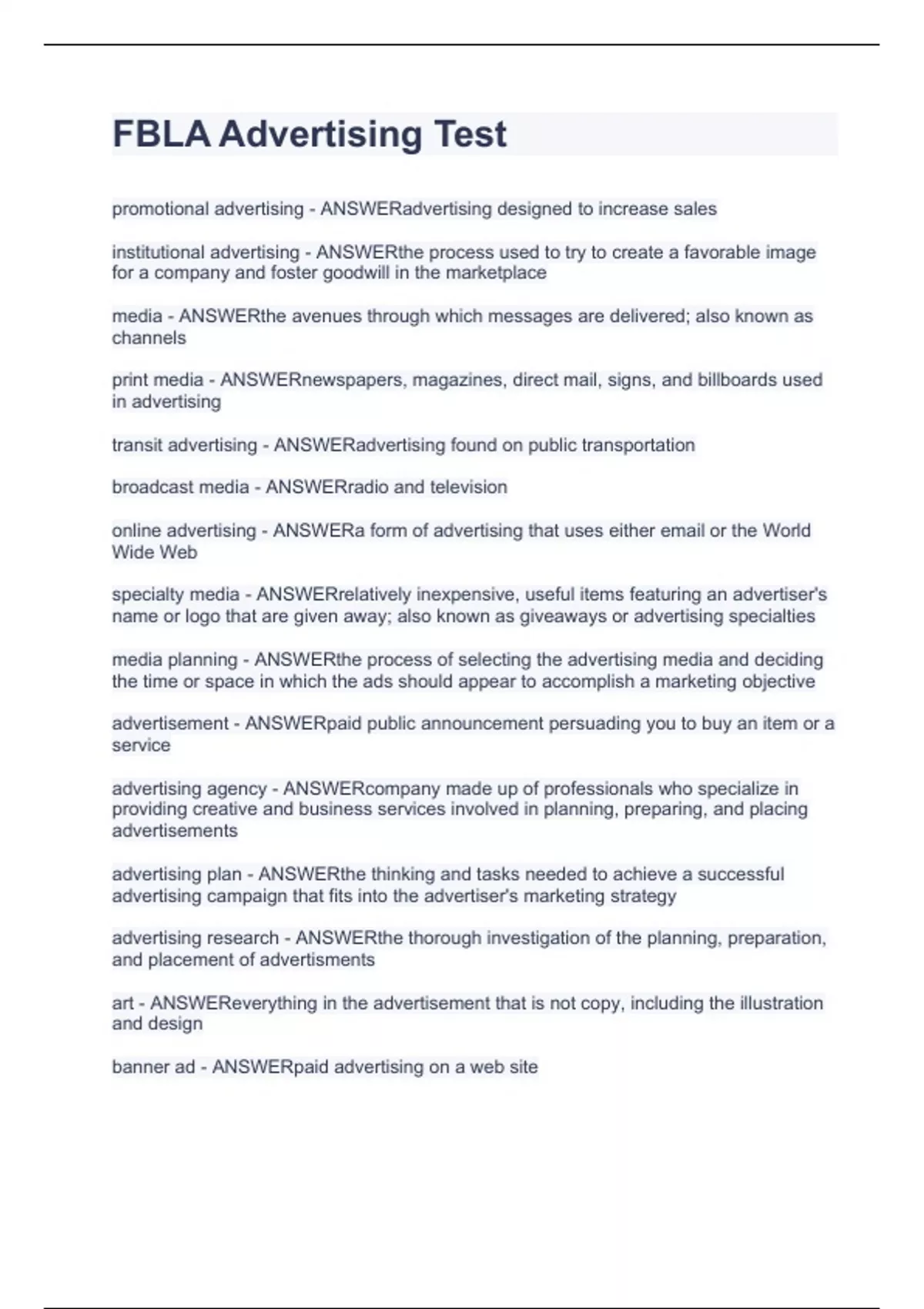 FBLA Advertising Test.Final exams with comprehensive test guide