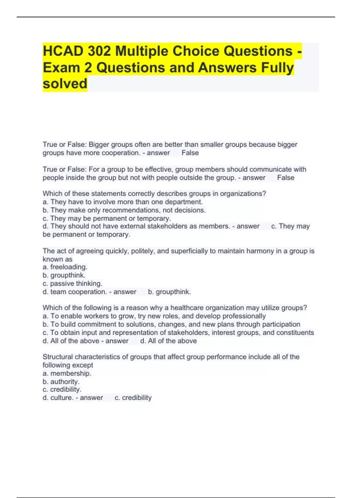 HCAD 302 Multiple Choice Questions - Exam 2 Questions and Answers Fully solved True or False: Bigger groups often are better than smaller groups because bigger groups have more cooperation. False True or False: For a group to be effective, group members should communicate with people inside the group but not with people outside the group. False Which of these statements correctly describes groups in organizations? a. They have to involve more than one department. b. They make only recommendations, not decisions. c. They may be permanent or temporary. d. They should not have external stakeholders as members. c. They may be permanent or temporary. The act of agreeing quickly, politely, and superficially to maintain harmony in a group is known as a. freeloading. b. groupthink. c. passive thinking. d. team cooperation. b. groupthink. Which of the following is a reason why a healthcare organization may utilize groups? a. To enable workers to grow, try new roles, and develop professionally b. To build commitment to solutions, changes, and new plans through participation c. To obtain input and representation of stakeholders, interest groups, and constituents d. All of the above d. All of the above Structural characteristics of groups that affect group performance include all of the following except a. membership. b. authority. c. credibility. d. culture. c. credibility Which aspect of group structure guides the group, including how often the group meets and which resources it uses? a. Communication b. Purpose c. Decisions d. Leader b. purpose Which types of roles are helpful to groups? a. Maintenance roles b. Strategic roles c. Personal roles d. All of the above a. maintenance roles According to the group development model presented in Chapter 6, which of the following is likely to happen first when a new group begins to meet? a. Members will argue, disagree, and create conflicts. b. Members will set up ground rules for how they work together. c. Members will get acquainted and try to figure out what is OK. d. Members will get to work on their tasks and goals. c. Members will get acquainted and try to figure out what is OK. Group decision making a. works best when members quickly agree with each other. b. might not be effective because of a lack of accountability. c. should be done democratically with all group members voting. d. is affected by group processes but not by group structures. b. might not be effective because of a lack of accountability. True or False: Healthcare organizations are considered to be labor intensive. True True or False: Because of urgency of decisions in healthcare organizations, a trend in hiring is to use just one person rather than a team approach. False True or False: Managers' flexibility in how they staff their organizations is restricted by numerous laws. True True or False: Although performance appraisals are important to guide better performance by employees, managers sometimes avoid performance appraisals. True Which of the following is one of the seven processes needed for staffing? a. Sick pay b. Training appraisal c. Job design d. Performance representation c. Job design Advantages of internal recruitment (as compared to external recruitment) include all of the following except a. it costs less time and money. b. it provides more potential applicants. c. it helps the morale of existing employees. d. it requires less orientation of the person hired. b. it provides more potential applicants. Hiring someone to fill a job vacancy is likely to involve everything listed below except a. pay raise. b. job offer. c. interview. d. recruitment. a. pay raise Staff planning should consider a. likely promotions and retirements. b. strategic plan and goals. c. recent SWOT analysis. d. all of the above. d. all of the above A job description usually includes a. job duties and benefit package. b. benefit package and job qualifications. c. job qualifications and job duties. d. all of the above. c. job qualifications and job duties Who usually does the hiring of new employees for departments in healthcare organizations? a. Department managers b. Human resources staff c. Chief executive officer d. Department managers and human resources staff d. Department managers and human resources staff Which of the following is needed prior to interviewing job applicants? a. Current job description b. Ten highly qualified applicants c. Detailed reference checks d. A formal job offer a. Current job description True or False: An accurate job description is an important resource for determining appropriate pay for a job. True True or False: Managers sometimes inflate their evaluations of employees to avoid conflicts with employees. True The formal, systematic assessment of how well employees do their jobs in relation to established standards is a a. performance appraisal. b. job review. c. priority assessment. d. satisfaction evaluation. a. performance appraisal One method of evaluating a healthcare organization (HCO) employee's performance uses input from other workers who work above, below, and at the same level of the HCO as the employee. This method is a. structured peer evaluation. b. 360-degree evaluation. c. comprehensive evaluation. d. multilevel evaluation. b. 360-degree evaluation When doing a performance appraisal, a manager should do all of the following except a. examine an employee's performance rather than personality. b. lead a collaborative discussion with the employee. c. focus mostly on the employee's past performance. d. document the appraisal review for future follow-up c. focus mostly on the employee's past performance The pay rate for a particular job is often based on a. the value of the job compared to other jobs in the organization. b. how much an organization can afford to pay for the job. c. what other organizations in the community pay for that job. d. all of the above. d. all of the above When healthcare organization employees feel their rights and concerns are