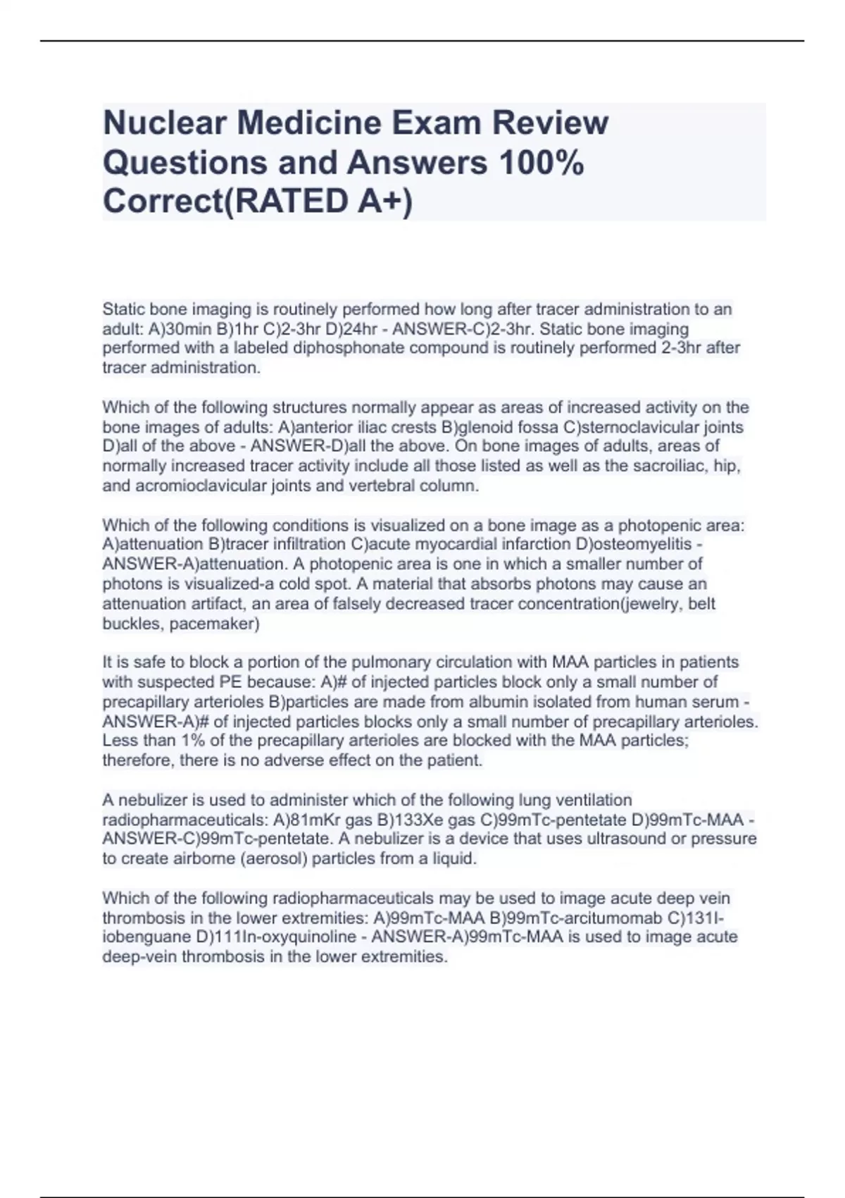 Nuclear Medicine Exam Review Questions and Answers 100% Correct(RATED A+)