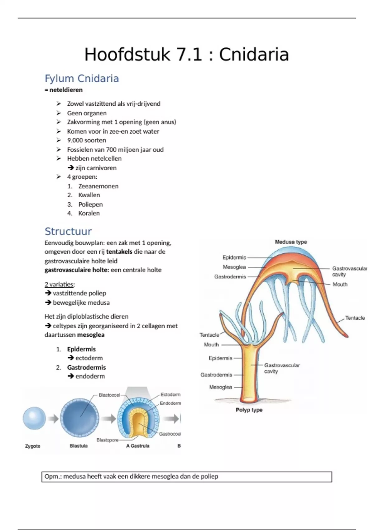 Opm.: medusa heeft vaak een dikkere mesoglea dan de poliep