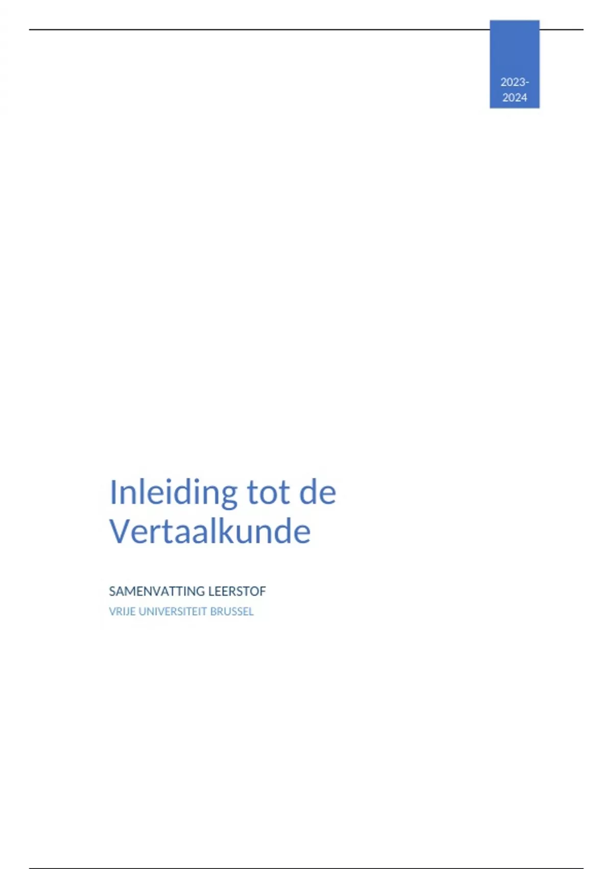 Deze samenvatting omvat alle te kennen leerstof voor het examen inleiding tot de vertaalkunde (toegepaste taalkunde aan de VUB)