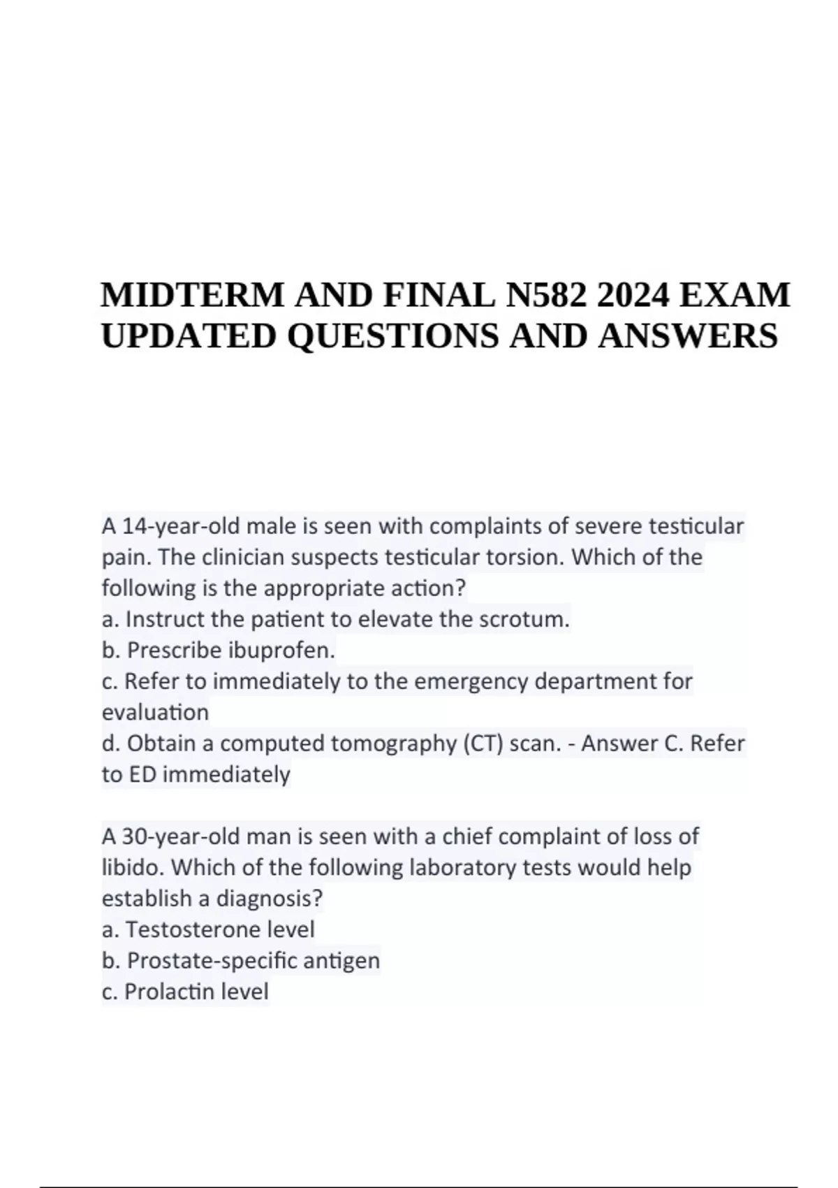 MIDTERM AND FINAL N582 2024 EXAM UPDATED QUESTIONS AND ANSWERS. A 14-year-old male is seen with complaints of severe testicular pain. The clinician suspects testicular torsion. Which of the following is the appropriate action? a. Instruct the patient to elevate the scrotum. b. Prescribe ibuprofen. c. Refer to immediately to the emergency department for evaluation d. Obtain a computed tomography (CT) scan. - Answer C. Refer to ED immediately A 30-year-old man is seen with a chief complaint of loss of libido. Which of the following laboratory tests would help establish a diagnosis? a. Testosterone level b. Prostate-specific antigen c. Prolactin level MIDTERM AND FINAL N582 2024 EXAM UPDATED QUESTIONS AND ANSWERS d. Nocturnal penile tumescence and rigidity - Answer A. Testosterone level A 35-year-old man presents with complaints of painful erections, and he notices his penis is crooked when erect. What is the most likely diagnosis? a. Peyronie's disease b. Damage to the pudendal artery c. Erectile dysfunction d. Testicular torsion - Answer A. Peyronie's disease An 82-year-old man is seen in the primary-care office with complaints of dribbling urine and difficulty starting his stream. Which of the following should be included in the list of differential diagnoses? a. Urethral stricture b. Prostate cancer c. All above d. Benign prostatic hyperplasia - Answer C. All of the above Peter is a 40-year-old male with a recent diagnosis of low testosterone. Which of the following counseling points is correct regarding low testosterone? a.Stress has no effect on testosterone levels. b.Lowering your HbA1c may improve your testosterone levels. c.Abstaining from cigarette smoking has no effect on testosterone d.Testosterone deficiency is due to hypergonadism. - Answer B. Lowering your A1C may improve your testosterone levels The 56-year-old man with chronic prostatitis should be treated with levofloxacin for how long? a.3 to 7 days b.4 to 6 weeks c.6 to 12 weeks d.14 to 21 days - Answer B. 4 to 6 weeks The patient with BPH is seen for follow-up. He has been taking finasteride (Proscar) for 6 months. The clinician should assess this patient for which of these side effects? a.Hypertension b.Headache c.Erectile dysfunction d.Glaucoma - Answer C. Erectile dysfunction Which of the following is a correct ACS (the American Cancer Society) recommendation of when to begin prostate screening? a.Asian American men should start screening at age 45. b.Men with no symptoms of prostate cancer and who are in good health should start screening at age 70. c.Caucasian men should start screening at age 55. d.African American men who have had a brother diagnosed with prostate cancer before the age of 65 should start screening at 45. - Answer D. African American men who have had a brother diagnosed with prostate cancer before the age of 65 should start screening at 45.