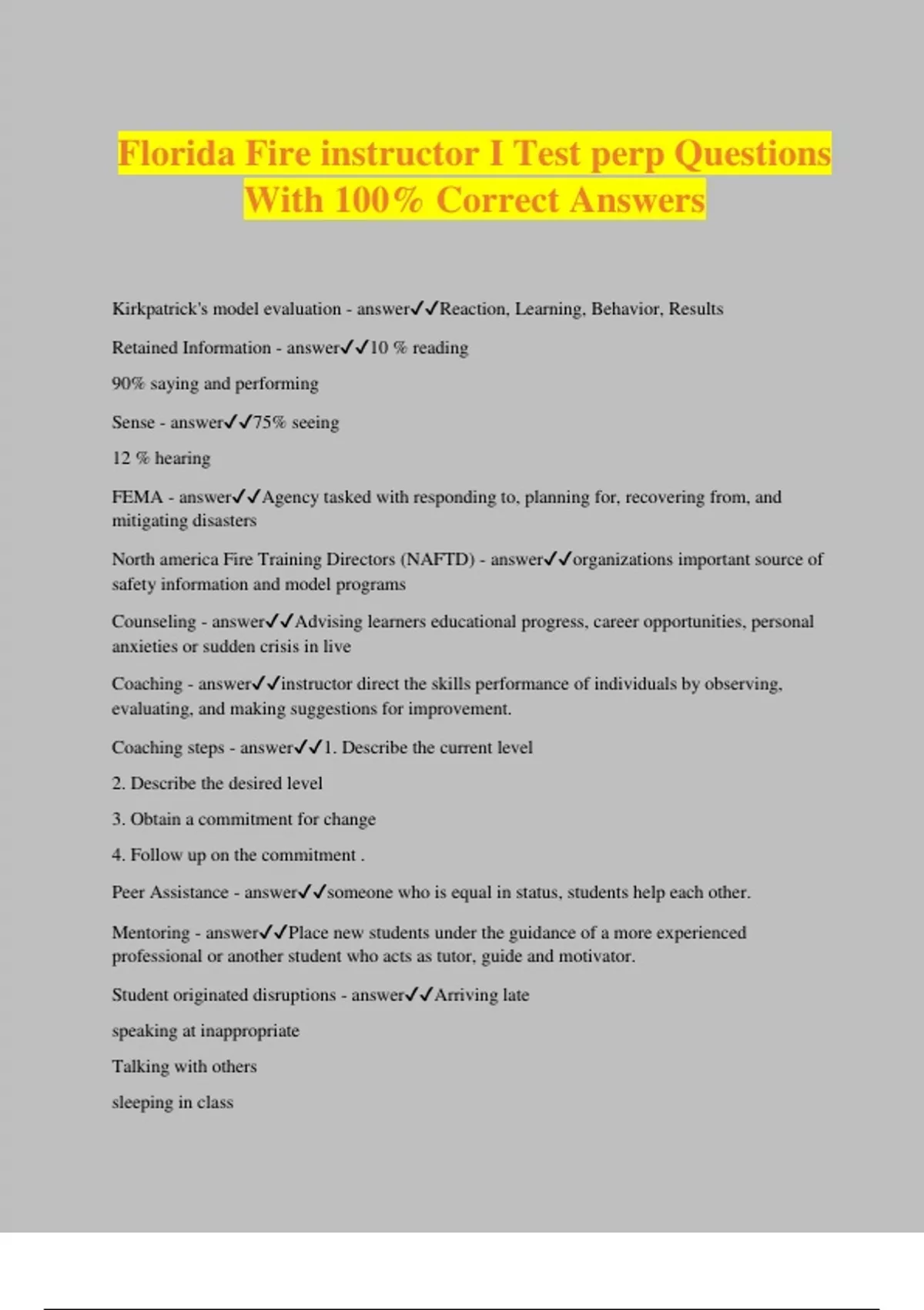 Florida Fire instructor I Test perp Questions With 100% Correct Answers Kirkpatrick's model evaluation - answerReaction, Learning, Behavior, Results Retained Information - answer10 % reading 90% saying and performing Sense - answer75% seeing 12 % hearing FEMA - answerAgency tasked with responding to, planning for, recovering from, and mitigating disasters North america Fire Training Directors (NAFTD) - answerorganizations important source of safety information and model programs Counseling - answerAdvising learners educational progress, career opportunities, personal anxieties or sudden crisis in live Coaching - answerinstructor direct the skills performance of individuals by observing, evaluating, and making suggestions for improvement. Coaching steps - answer1. Describe the current level 2. Describe the desired level 3. Obtain a commitment for change 4. Follow up on the commitment . Peer Assistance - answersomeone who is equal in status, students help each other. Mentoring - answerPlace new students under the guidance of a more experienced professional or another student who acts as tutor, guide and motivator. Student originated disruptions - answerArriving late speaking at inappropriate Talking with others sleeping in class showing off interrupting others sidetracking disrespectful L E A S T (progressive disciplinary) - answerLeave it alone Eye Contact Action Stop the class Terminate the student. Norm Referenced assessments - answerstudents performance is compared to that of other students Criterion Referenced assessments - answerstudents performance against a set standard or criteria Evaluation - answersystematic and thoughtful collection of information Prescriptive ( Pretest) - answerbeginning of instruction to determine what students already know Formative ( Progress) - answerquizzes, pop test, question / answer throughout the course or session Summative ( Comprehensive) - answerknowledge and skills at the end or course. Administration Classification - answerOral Written Performance Written Test - answerMultiple choice True / false Matching Fill in the blank Short Essay Performance Test - answerDetermine materials, tools, skill checklist, number of evaluators, review unfamiliar equipment. Oral Test - answera one - one intera