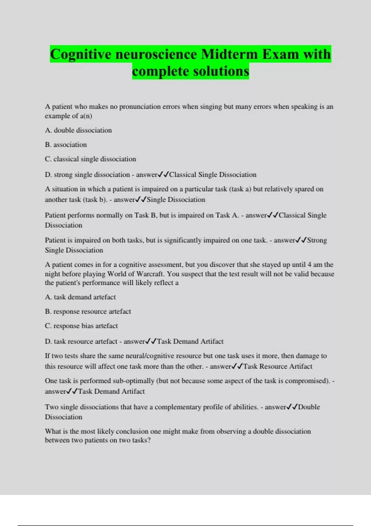 Cognitive neuroscience Midterm Exam with complete solutions A patient who makes no pronunciation errors when singing but many errors when speaking is an example of a(n) A. double dissociation B. association C. classical single dissociation D. strong single dissociation - answerClassical Single Dissociation A situation in which a patient is impaired on a particular task (task a) but relatively spared on another task (task b). - answerSingle Dissociation Patient performs normally on Task B, but is impaired on Task A. - answerClassical Single Dissociation Patient is impaired on both tasks, but is significantly impaired on one task. - answerStrong Single Dissociation A patient comes in for a cognitive assessment, but you discover that she stayed up until 4 am the night before playing World of Warcraft. You suspect that the test result will not be valid because the patient's performance will likely reflect a A. task demand artefact B. response resource artefact C. response bias artefact D. task resource artefact - answerTask Demand Artifact If two tests share the same neural/cognitive resource but one task uses it more, then damage to this resource will affect one task more than the other. - answerTask Resource Artifact One task is performed sub-optimally (but not because some aspect of the task is compromised). - answerTask Demand Artifact Two single dissociations that have a complementary profile of abilities. - answerDouble Dissociation What is the most likely conclusion one might make from observing a double dissociation between two patients on two tasks? A. The two tasks don't share any of the same neural/cognitive resources. B. The two tasks utilize some different neural/cognitive resources. C. The two tasks utilize the same neural and cognitive resources. D. One task is harder than the other. - answerB. The two tasks utilize some different neural/cognitive resources. You are a budding Neuropsychologist. While treating some patients with traumatic brain injury, you discover that some patients exhibit a rare behavior of speaking only in rhymes. Which of the following would be a better method to discover what region of the brain is responsible for the impairment in these patients? a. Conduct a group study b. Conduct a study using transcranial magnetic stimulation c. Conduct a study using transcranial direct current stimulation d. Conduct a case study - answera. Conduct a group study Non-invasive stimulation of the brain caused by a rapidly changing electrical current in a coil held over the scalp, producing "virtual lesions." - answerTranscranial Magnetic Stimulation (TMS) Non-invasive stimulation of the brain caused by passing a weak electrical current through it, providing a "virtual lesion." Also used to boost cognitive function which has important implications for rehabilitation. - answerTranscranial Direct current Stimulation (tDCS) (TMS/tDCS) has better temporal and spatial resolution than (TMS/tDCS). (TMS/tDCS) facilitate cognitive function, whereas (TMS/tDCS) typically is used to disrupt cognitive function. - answerTMS; tDCS; tDCS; TMS What are the two different types of structural imaging? - answerComputerized Tomography (CT) and Magnetic Resonance Imaging (MRI) Measures of the spatial configuration of different types of tissue in the brain (principally CT and MRI); based on the different physical properties of different types of tissue. - answerStructural Imagi
