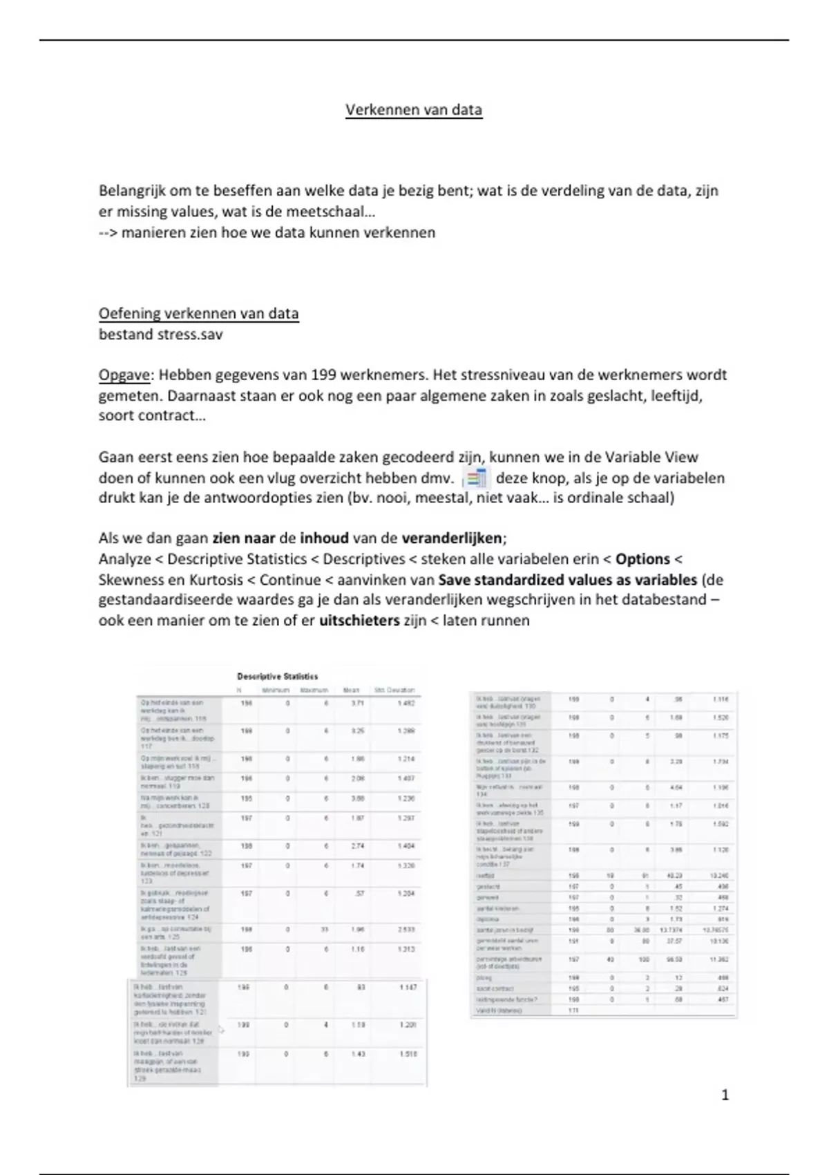 Dit document bevat al de oefeningen die worden behandeld tijdens de practica SPSS, inclusief uitgebreide uitleg en screenshots van de tabellen uit de les - geslaagd in 1e zit! (dit document mocht gebruikt worden tijdens het SPSS deel dat een open boek examen was) *tabellen zijn afkomst van de lessen van Isaac Alain