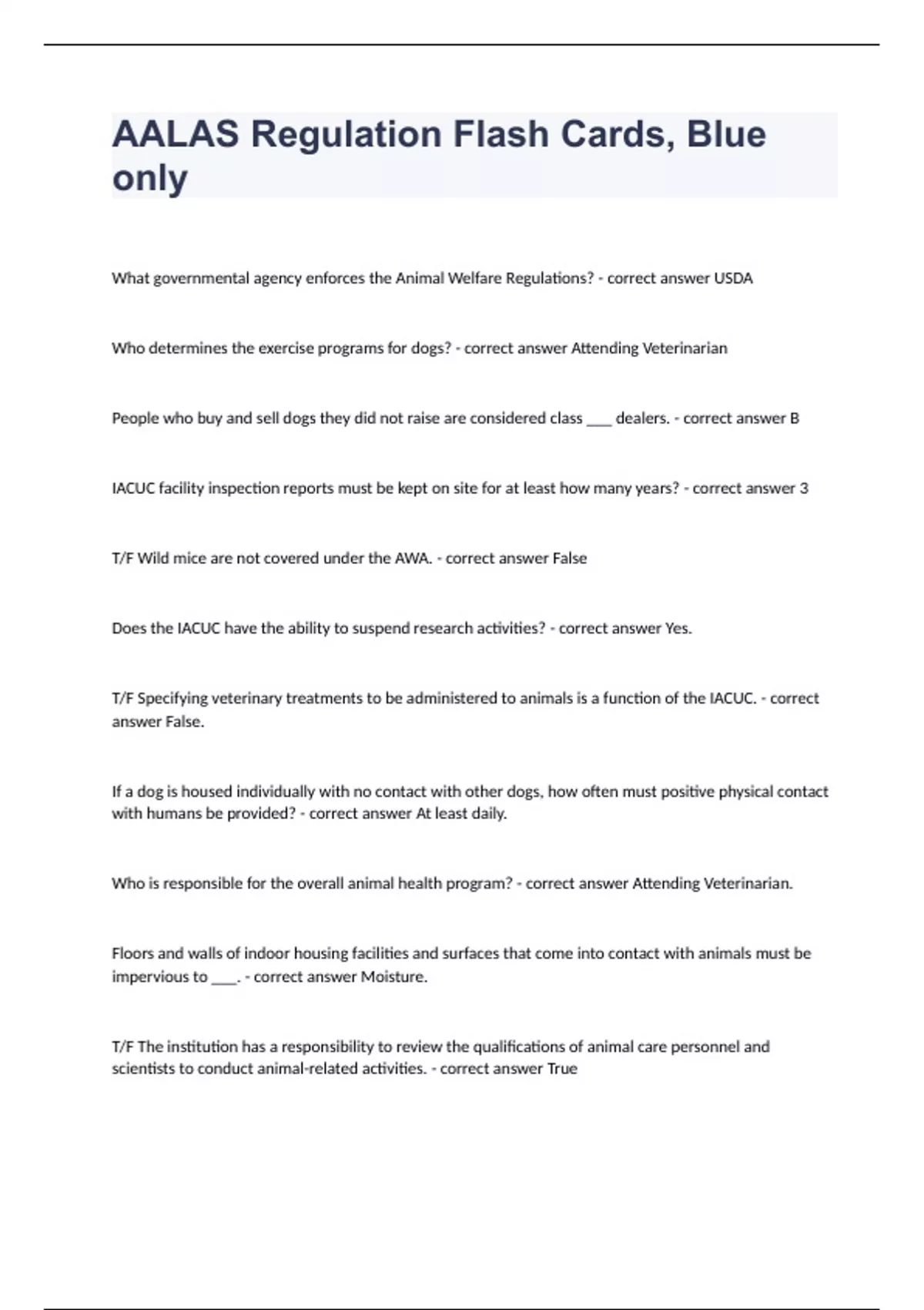 What governmental agency enforces the Animal Welfare Regulations? - correct answer USDA Who determines the exercise programs for dogs? - correct answer Attending Veterinarian People who buy and sell dogs they did not raise are considered class ___ dealers. - correct answer B IACUC facility inspection reports must be kept on site for at least how many years? - correct answer 3 T/F Wild mice are not covered under the AWA. - correct answer False Does the IACUC have the ability to suspend research activities? - correct answer Yes. T/F Specifying veterinary treatments to be administered to animals is a function of the IACUC. - correct answer False. If a dog is housed individually with no contact with other dogs, how often must positive physical contact with humans be provided? - correct answer At least daily. Who is responsible for the overall animal health program? - correct answer Attending Veterinarian. Floors and walls of indoor housing facilities and surfaces that come into contact with animals must be impervious to ___. - correct answer Moisture. T/F The institution has a responsibility to review the qualifications of animal care personnel and scientists to conduct animal-related activities. - correct answer True