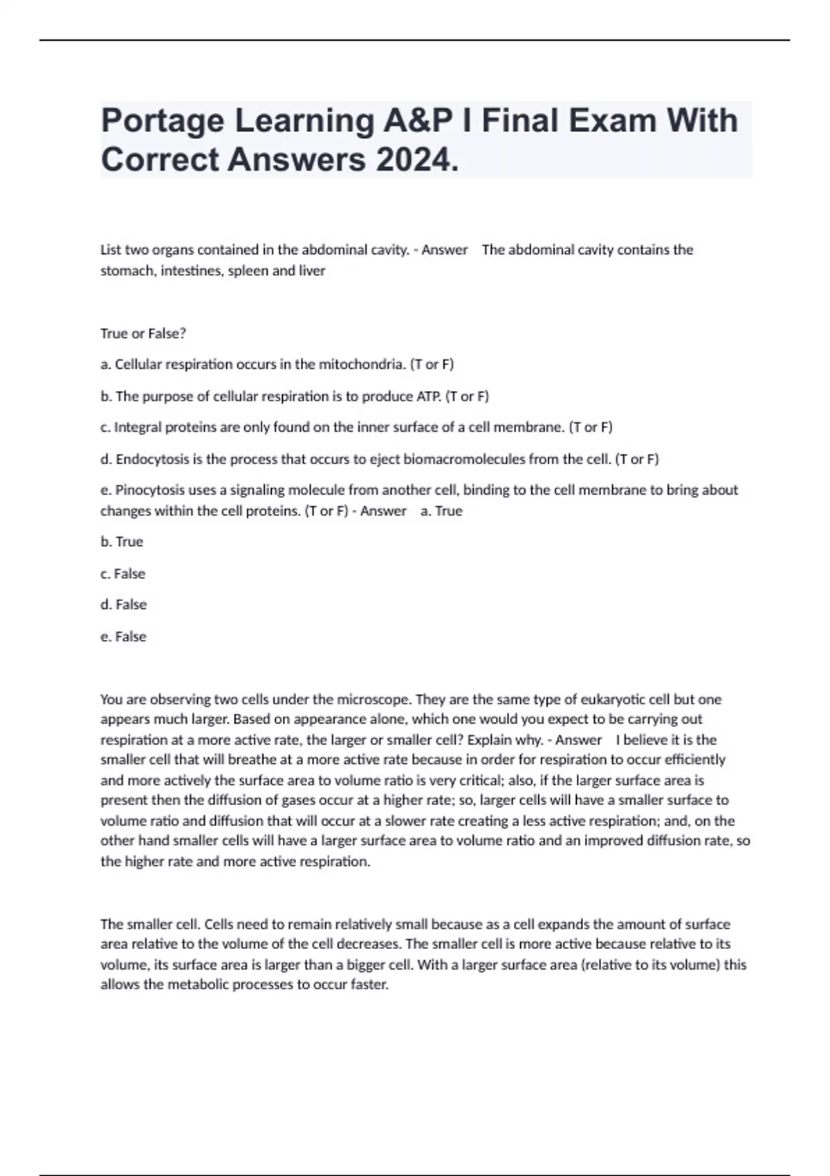 List two organs contained in the abdominal cavity. - Answer The abdominal cavity contains the stomach, intestines, spleen and liver True or False? a. Cellular respiration occurs in the mitochondria. (T or F) b. The purpose of cellular respiration is to produce ATP. (T or F) c. Integral proteins are only found on the inner surface of a cell membrane. (T or F) d. Endocytosis is the process that occurs to eject biomacromolecules from the cell. (T or F) e. Pinocytosis uses a signaling molecule from another cell, binding to the cell membrane to bring about changes within the cell proteins. (T or F) - Answer a. True b. True c. False d. False e. False You are observing two cells under the microscope. They are the same type of eukaryotic cell but one appears much larger. Based on appearance alone, which one would you expect to be carrying out respiration at a more active rate, the larger or smaller cell? Explain why. - Answer I believe it is the smaller cell that will breathe at a more active rate because in order for respiration to occur efficiently and more actively the surface area to volume ratio is very critical; also, if the larger surface area is present then the diffusion of gases occur at a higher rate; so, larger cells will have a smaller surface to volume ratio and diffusion that will occur at a slower rate creating a less active respiration; and, on the other hand smaller cells will have a larger surface area to volume ratio and an improved diffusion rate, so the higher rate and more active respiration. The smaller cell. Cells need to remain relatively small because as a cell expands the amount of surface area relative to the volume of the cell decreases. The smaller cell is more active because relative to its volume, its surface area is larger than a bigger cell. With a larger surface area (relative to its volume) this allows the metabolic processes to occur faster.
