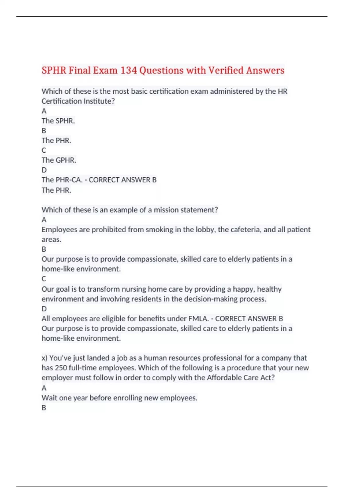 SPHR Final Exam 134 Questions with Verified Answers,100% CORRECT