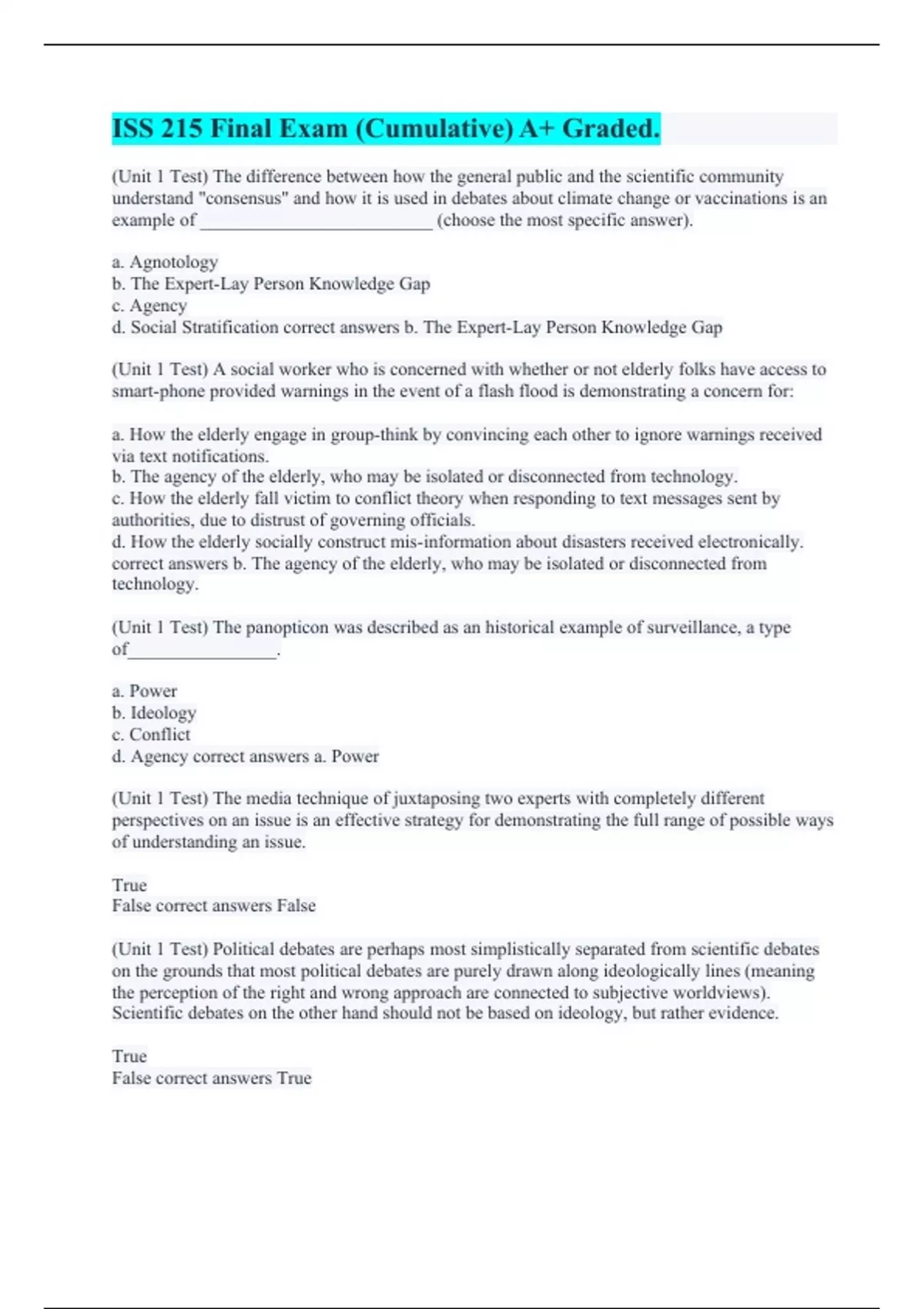 (Unit 1 Test) The difference between how the general public and the scientific community understand "consensus" and how it is used in debates about climate change or vaccinations is an example of _________________________ (choose the most specific answer). a. Agnotology b. The Expert-Lay Person Knowledge Gap c. Agency d. Social Stratification correct answers b. The Expert-Lay Person Knowledge Gap (Unit 1 Test) A social worker who is concerned with whether or not elderly folks have access to smart-phone provided warnings in the event of a flash flood is demonstrating a concern for: a. How the elderly engage in group-think by convincing each other to ignore warnings received via text notifications. b. The agency of the elderly, who may be isolated or disconnected from technology. c. How the elderly fall victim to conflict theory when responding to text messages sent by authorities, due to distrust of governing officials. d. How the elderly socially construct mis-information about disasters received electronically. correct answers b. The agency of the elderly, who may be isolated or disconnected from technology. (Unit 1 Test) The panopticon was described as an historical example of surveillance, a type of________________. a. Power b. Ideology c. Conflict d. Agency correct answers a. Power (Unit 1 Test) The media technique of juxtaposing two experts with completely different perspectives on an issue is an effective strategy for demonstrating the full range of possible ways of understanding an issue. True False correct answers False (Unit 1 Test) Political debates are perhaps most simplistically separated from scientific debates on the grounds that most political debates are purely drawn along ideologically lines (meaning the perception of the right and wrong approach are connected to subjective worldviews). Scientific debates on the other hand should not be based on ideology, but rather evidence. True False correct answers True