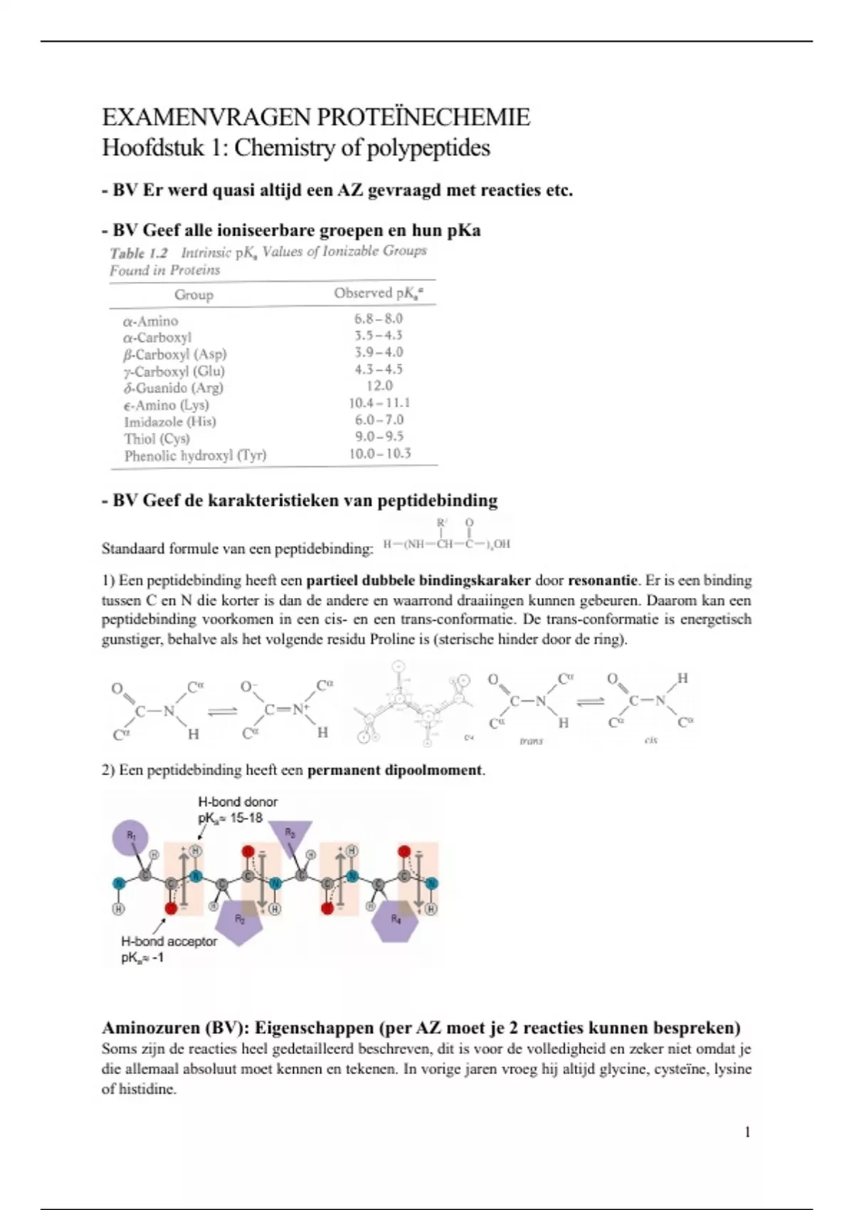 1) Een peptidebinding heeft een partieel dubbele bindingskaraker door resonantie. Er is een binding