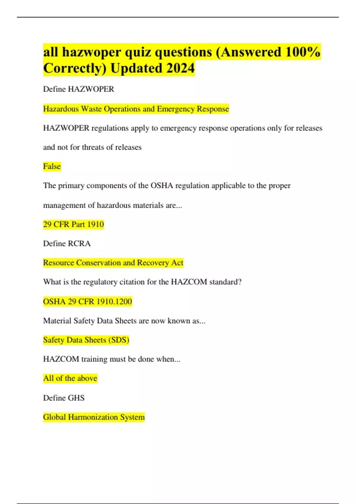 all hazwoper quiz questions (Answered 100% Correctly) Updated 2024 all hazwoper quiz questions (Answered 100% Correctly) Updated 2024 Define HAZWOPER Hazardous Waste Operations and Emergency Response HAZWOPER regulations apply to emergency response operations only for releases and not for threats of releases False The primary components of the OSHA regulation applicable to the proper management of hazardous materials are... 29 CFR Part 1910 Define RCRA Resource Conservation and Recovery Act What is the regulatory citation for the HAZCOM standard? OSHA 29 CFR 1910.1200 Material Safety Data Sheets are now known as... Safety Data Sheets (SDS) HAZCOM training must be done when... All of the above Define GHS Global Harmonization System _____ convey health, physical, and environmental hazard information, assigned to a GHS hazard class and category Symbols (hazard pictograms) Each _____ must be labeled tagged or marked Container If a chemical has a GHS rating of 4 it is... Least hazardous If a chemical has a GHS rating of 1 it is... Most hazardous How many sections are there on a SDS? 16 A(n) ______ must be on hand for each hazardous chemical used. SDS How many mandatory sections are there on an SDS? 12 SDS's must be _____ accessible to employees during their work shift Readily The ______ should specifically identify the names and organizational relationships among key personnel HASP How has responsibility for overall management of the project? Project manager The Site Safety and Health Officer is responsible for _____ Managing the health and safety program for the site Who is responsible for maintaining line-of-site at a HAZWOPER site? Command post supervisor The security officer is responsible for... Controlling facility access and egress The ______ is responsible for planning and mobilization of the facilities Logistics officer ______ consisting of field team members who complete the onsite tasks required to fulfill the work plan Specialty teams The specific responsibilities of the ________ should be stated (e.g. providing advice on methods of handling explosive materials and assisting in safely detonating or disposing of explosive materials) Bomb squad expert The purpose of a site control program is to... All of the above Site control zones at a hazardous materials incident are established primarily...
