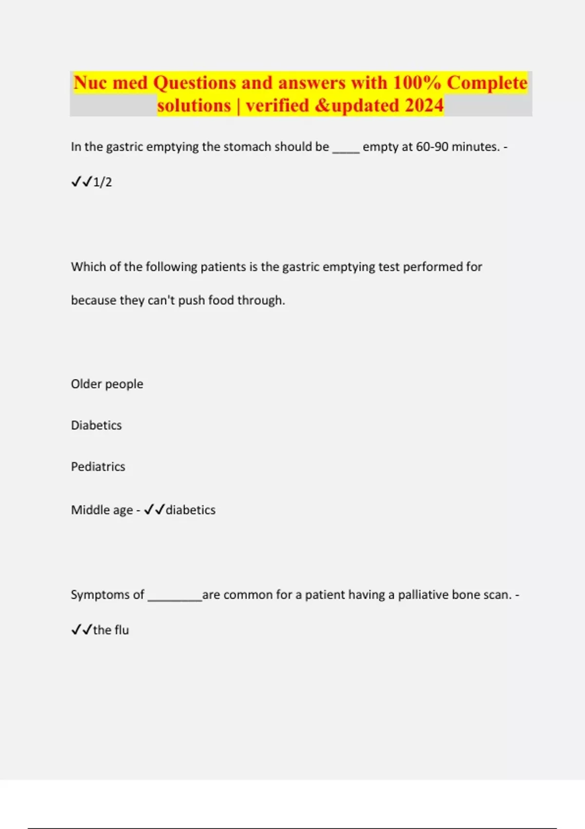 Nuc med Questions and answers with 100% Complete solutions | verified &updated 2024 In the gastric emptying the stomach should be ____ empty at 60-90 minutes. - 1/2 Which of the following patients is the gastric emptying test performed for because they can't push food through. Older people Diabetics Pediatrics Middle age - diabetics Symptoms of ________are common for a patient having a palliative bone scan. - the flu With respect to NM which of the following may be considered a patient concern? Being radioactive Fear of needles Claustrophobia All of the above - all of the above