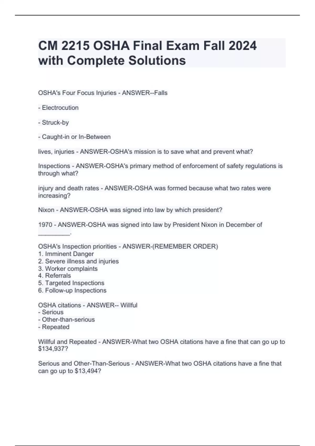 CM 2215 OSHA Final Exam Fall 2024 with Complete SolutionsCM 2215 OSHA Final Exam Fall 2024 with Complete SolutionsCM 2215 OSHA Final Exam Fall 2024 with Complete SolutionsCM 2215 OSHA Final Exam Fall 2024 with Complete SolutionsOSHA's Four Focus Injuries - ANSWER--Falls - Electrocution - Struck-by - Caught-in or In-Between lives, injuries - ANSWER-OSHA's mission is to save what and prevent what? Inspections - ANSWER-OSHA's primary method of enforcement of safety regulations is through what? injury and death rates - ANSWER-OSHA was formed because what two rates were increasing?