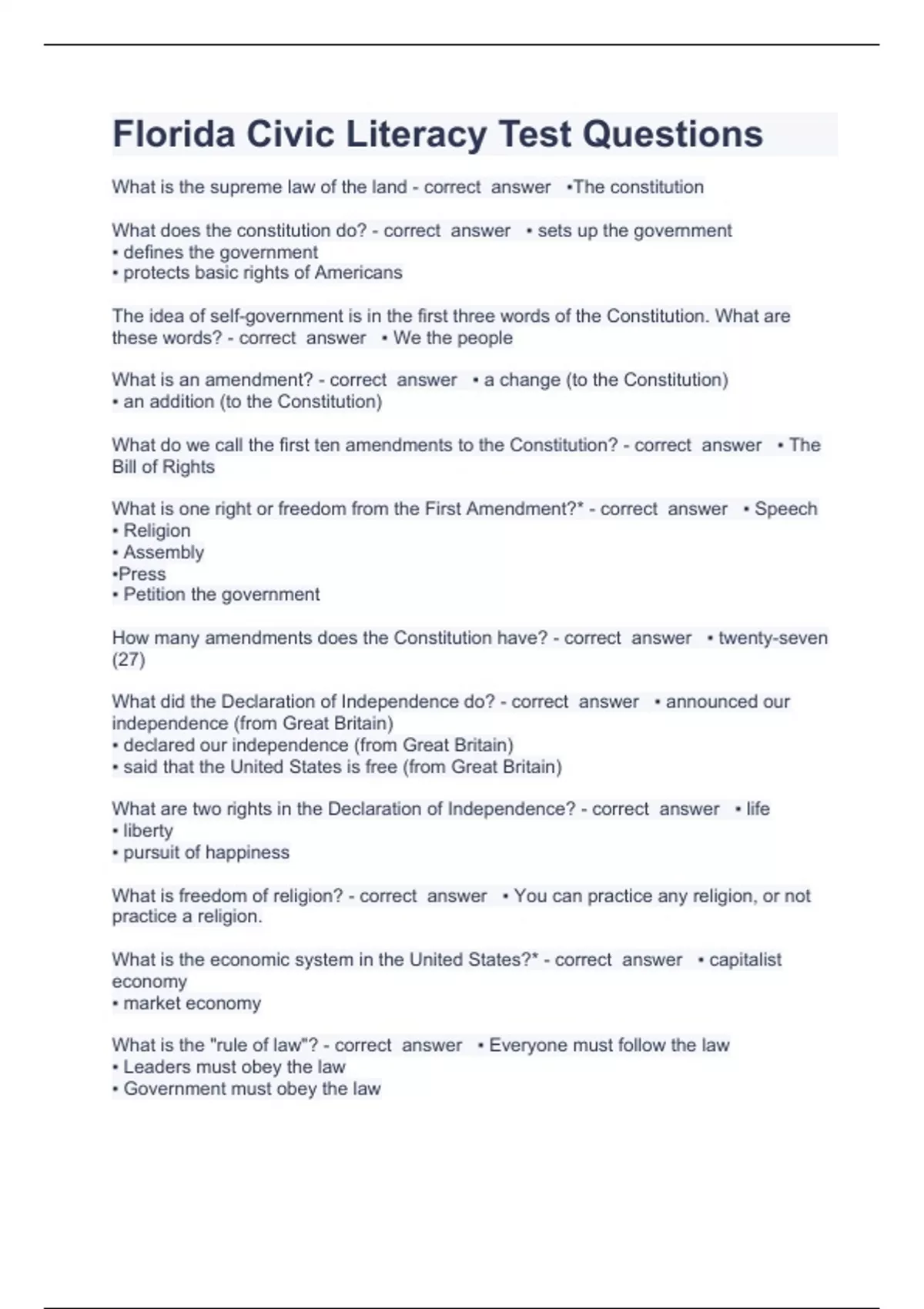 CLEP Florida Civic Literacy Test Questions AND CCCURATE QUALIFIED ANSWERS 2023/2024 What is the supreme law of the land - correct answer ▪The constitution What does the constitution do? - correct answer ▪ sets up the government ▪ defines the government ▪ protects basic rights of Americans The idea of self-government is in the first three words of the Constitution. What are these words? - correct answer ▪ We the people What is an amendment? - correct answer ▪ a change (to the Constitution) ▪ an addition (to the Constitution) What do we call the first ten amendments to the Constitution? - correct answer ▪ The Bill of Rights What is one right or freedom from the First Amendment?* - correct answer ▪ Speech ▪ Religion ▪ Assembly ▪Press ▪ Petition the government How many amendments does the Constitution have? - correct answer ▪ twenty-seven (27) What did the Declaration of Independence do? - correct answer ▪ announced our independence (from Great Britain) ▪ declared our independence (from Great Britain) ▪ said that the United States is free (from Great Britain) What are two rights in the Declaration of Independence? - correct answer ▪ life ▪ liberty ▪ pursuit of happiness What is freedom of religion? - correct answer ▪ You can practice any religion, or not practice a religion. What is the economic system in the United States?* - correct answer ▪ capitalist economy ▪ market economy What is the "rule of law"? - correct answer ▪ Everyone must follow the law ▪ Leaders must obey the law ▪ Government must obey the law ▪ No one is above the law Name one branch or part of the government.* - correct answer ▪ Congress ▪ legislative ▪ President ▪ executive ▪ the courts ▪ judicial What stops one branch of government from becoming too powerful? - correct answer ▪ checks and balances ▪ separation of powers Who is in charge of the executive branch? - correct answer ▪ the President Who makes federal laws? - correct answer ▪ Congress ▪ Senate and House (of Representatives) ▪ (U.S. or national) legislature What are the two parts of the U.S. Congress?* - correct answer ▪ the Senate and House (of Representatives) How many U.S. Senators are there? - correct answer ▪ 100 We elect a U.S. Senator for how many years? - correct answer ▪ six (6) Who is one of your state's U.S. Senators now?* - correct answer ▪ Marco Rubio