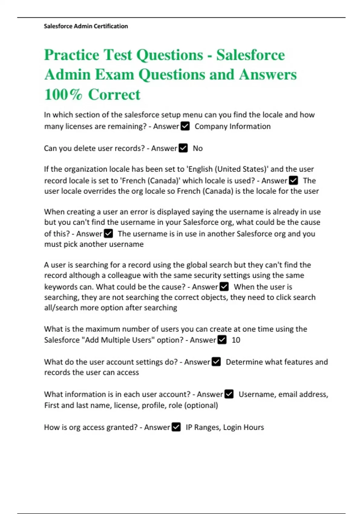 Practice Test Questions - Salesforce Admin Exam Questions and Answers 100% Correct
