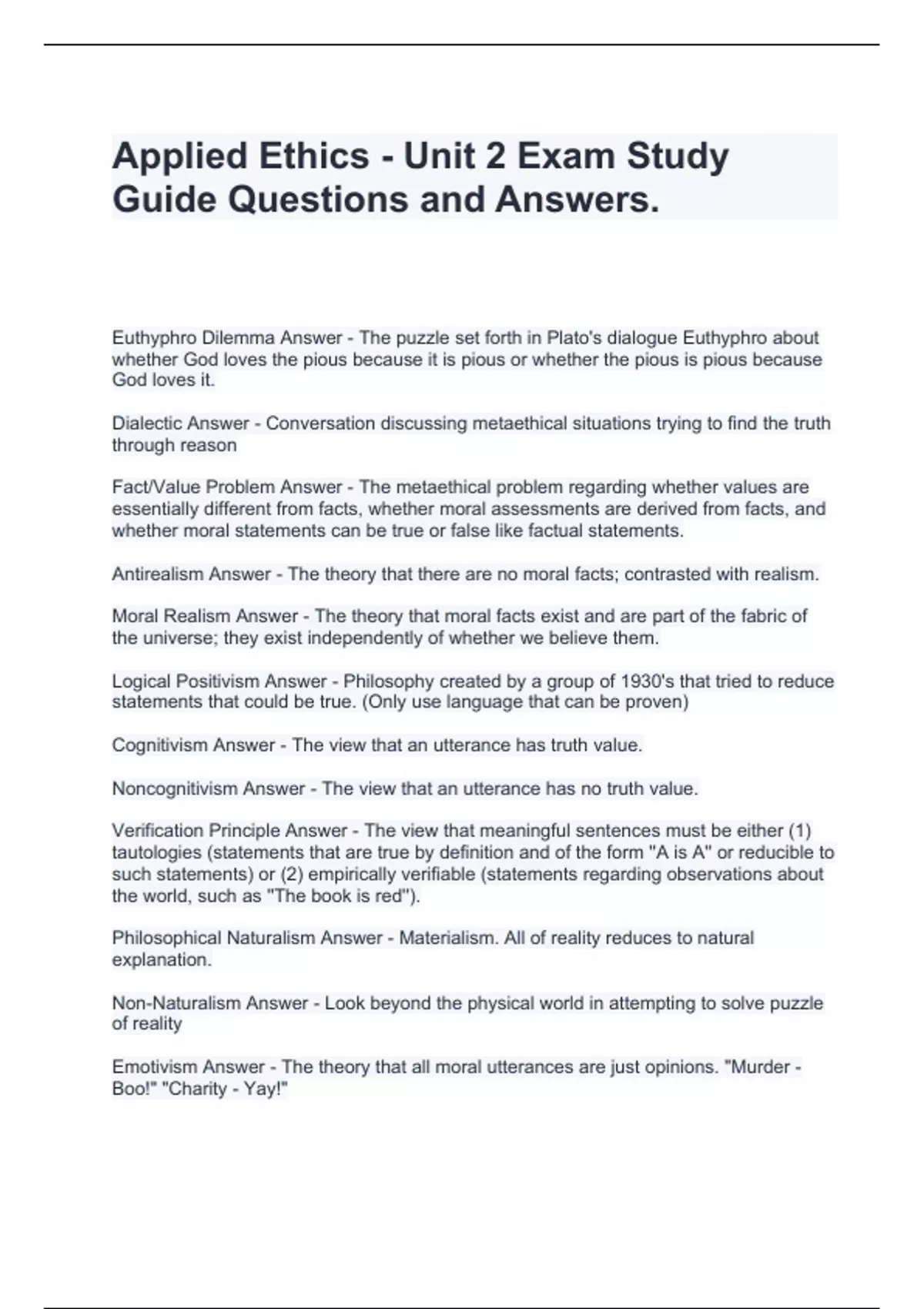Applied Ethics - Unit 2 Exam Study Guide Questions and Answers.