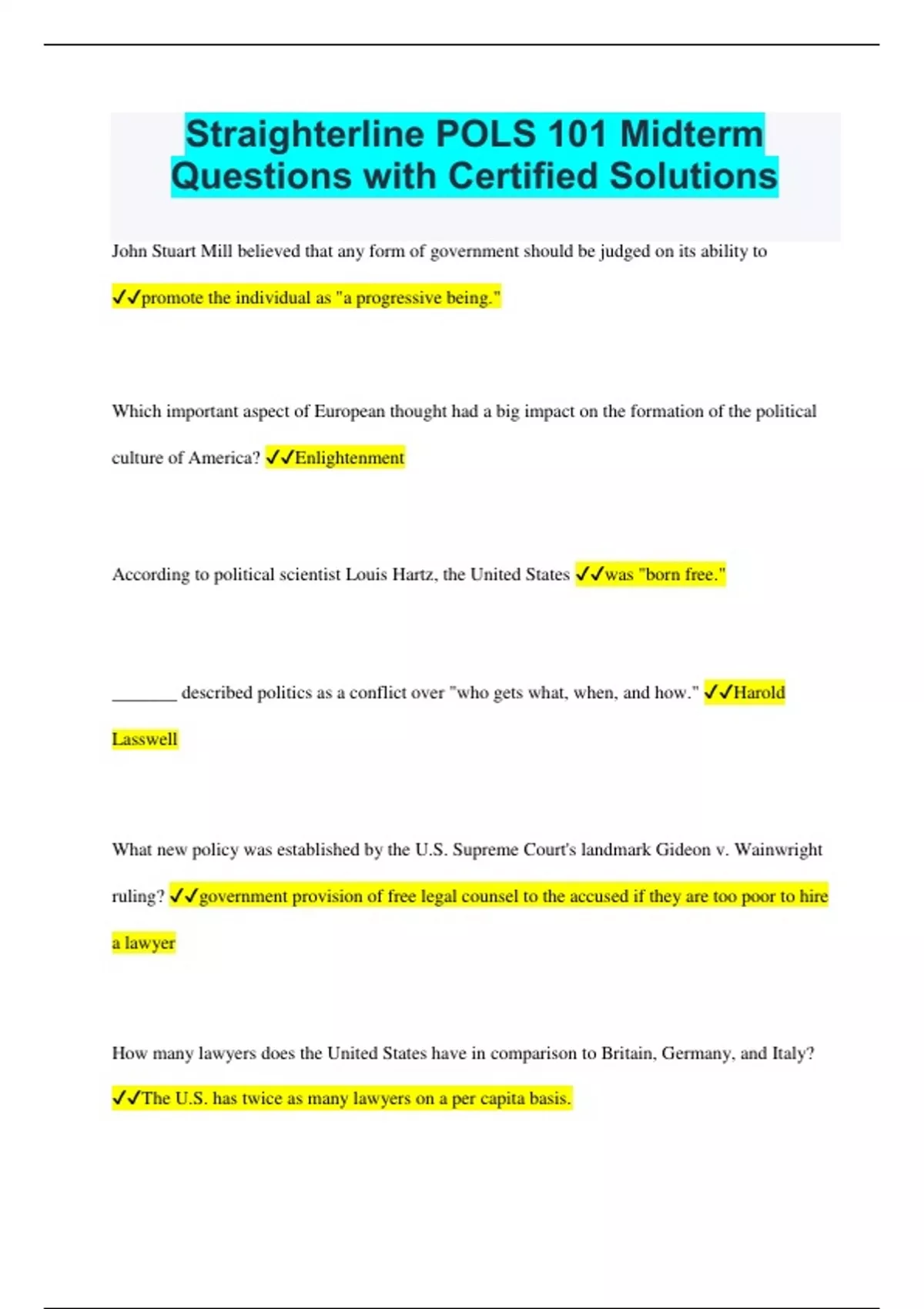 Straighterline POLS 101 Midterm Questions with Certified Solutions John Stuart Mill believed that any form of government should be judged on its ability to promote the individual as "a progressive being." Which important aspect of European thought had a big impact on the formation of the political culture of America? Enlightenment According to political scientist Louis Hartz, the United States was "born free." _______ described politics as a conflict over "who gets what, when, and how." Harold Lasswell What new policy was established by the U.S. Supreme Court's landmark Gideon v. Wainwright ruling? government provision of free legal counsel to the accused if they are too poor to hire a lawyer How many lawyers does the United States have in comparison to Britain, Germany, and Italy? The U.S. has twice as many lawyers on a per capita basis. Enormous concentrations of wealth and power exist in the U.S. private sector, primarily in the hands of: large corporations A government's authority is evidenced when government officials use their right to exercise power. Political knowledge has been shown to be important because it fosters civic participation In a survey of college students, the Intercollegiate Studies Association found that the best predictor of a student's later participation in the nation's civic and political life is a solid understanding of public affairs. Under the New Jersey Plan, each state would have ____ vote(s) in Congress. one The Articles of Confederation Created a weak national government subordinate to the states. The direct election of U.S. senators came about due to political pressure from the Progressives The Bill of Rights are also known as the first 10 amendments to the Constitution. The term of office for a U.S. senator is ________ years, while that of a member of the U.S. House is ________ years. six; two Where is the Bill of Rights found in the Constitution? the first ten amendments Judicial review is the power of the American courts to declare a law unconstitutional. The Constitution allows states to govern intrastate commerce Which of the following individuals would agree that each state should be allowed to determine for itself the extent to which national authority restricts its actions? John C. Calhoun All of the following embraced the "national view" of federalism EXCEPT: Roger Taney The TANF aspect of the Welfare Reform Act was