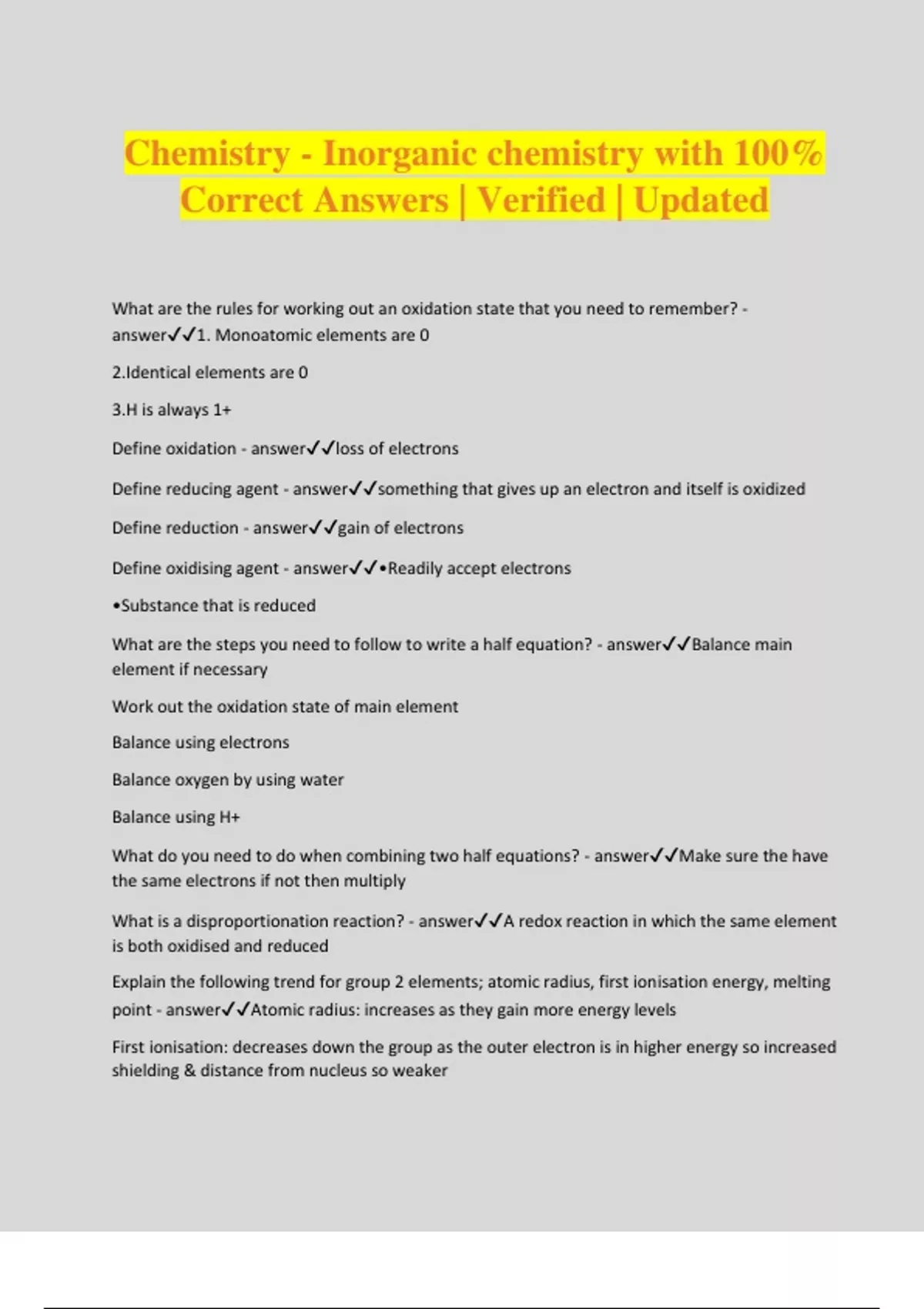 Chemistry - Inorganic chemistry with 100% Correct Answers | Verified | Updated What are the rules for working out an oxidation state that you need to remember? - answer1. Monoatomic elements are 0 2.Identical elements are 0 3.H is always 1+ Define oxidation - answerloss of electrons Define reducing agent - answersomething that gives up an electron and itself is oxidized Define reduction - answergain of electrons Define oxidising agent - answer•Readily accept electrons •Substance that is reduced What are the steps you need to follow to write a half equation? - answerBalance main element if necessary Work out the oxidation state of main element Balance using electrons Balance oxygen by using water Balance using H+ What do you need to do when combining two half equations? - answerMake sure the have the same electrons if not then multiply What is a disproportionation reaction? - answerA redox reaction in which the same element is both oxidised and reduced Explain the following trend for group 2 elements; atomic radius, first ionisation energy, melting point - answerAtomic radius: increases as they gain more energy levels First ionisation: decreases down the group as the outer electron is in higher energy so increased shielding & distance from nucleus so weaker Mp: Decreases down the group Explain why group 2 metals have a smaller atomic radius than the preceding group 1 metal - answer Explain why the second ionisation en