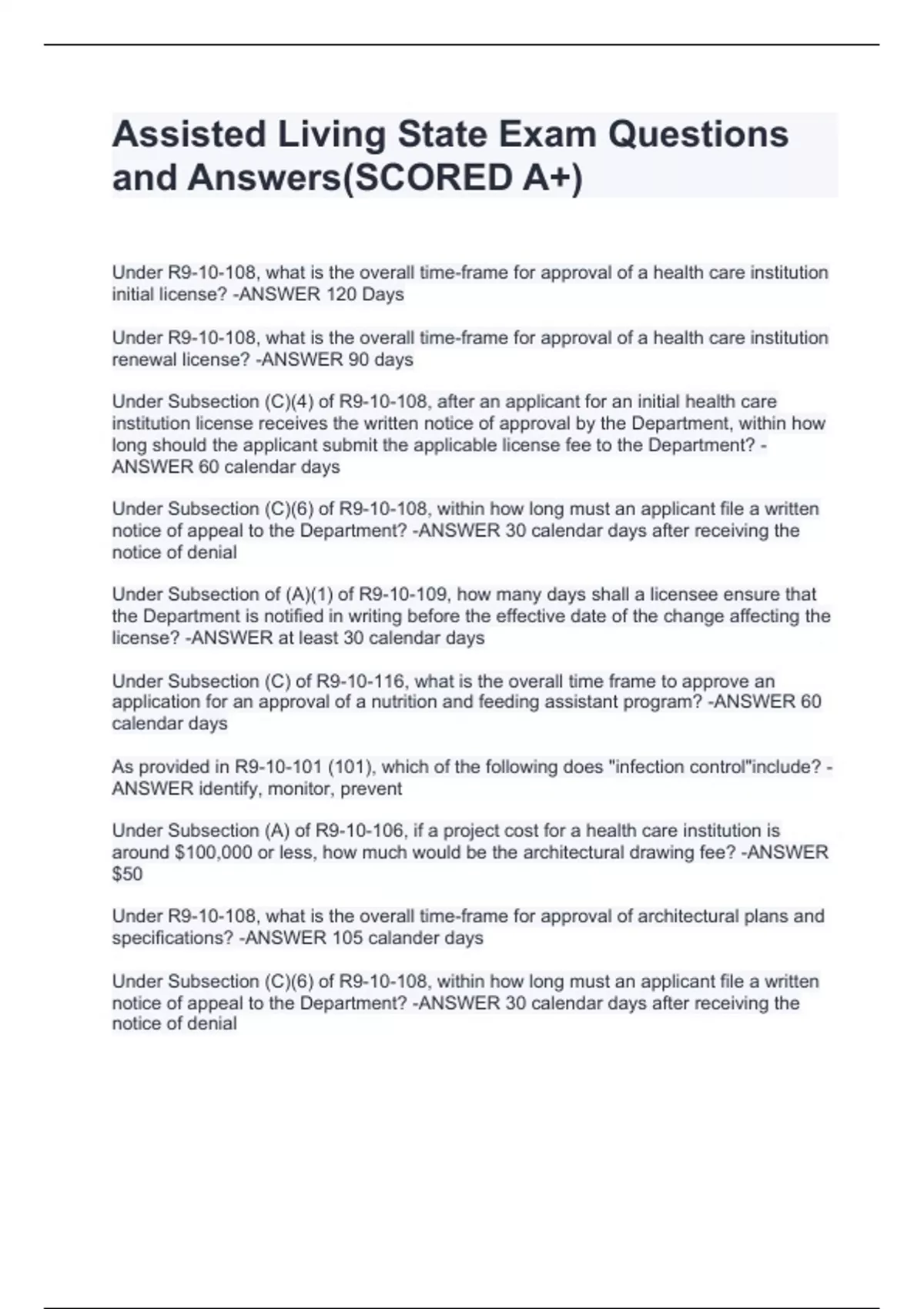 Under R9-10-108, what is the overall time-frame for approval of a health care institution initial license? -ANSWER 120 Days Under R9-10-108, what is the overall time-frame for approval of a health care institution renewal license? -ANSWER 90 days Under Subsection (C)(4) of R9-10-108, after an applicant for an initial health care institution license receives the written notice of approval by the Department, within how long should the applicant submit the applicable license fee to the Department? -ANSWER 60 calendar days Under Subsection (C)(6) of R9-10-108, within how long must an applicant file a written notice of appeal to the Department? -ANSWER 30 calendar days after receiving the notice of denial Under Subsection of (A)(1) of R9-10-109, how many days shall a licensee ensure that the Department is notified in writing before the effective date of the change affecting the license? -ANSWER at least 30 calendar days Under Subsection (C) of R9-10-116, what is the overall time frame to approve an application for an approval of a nutrition and feeding assistant program? -ANSWER 60 calendar days As provided in R9-10-101 (101), which of the following does "infection control"include? -ANSWER identify, monitor, prevent Under Subsection (A) of R9-10-106, if a project cost for a health care institution is around $100,000 or less, how much would be the architectural drawing fee? -ANSWER $50 Under R9-10-108, what is the overall time-frame for approval of architectural plans and specifications? -ANSWER 105 calander days