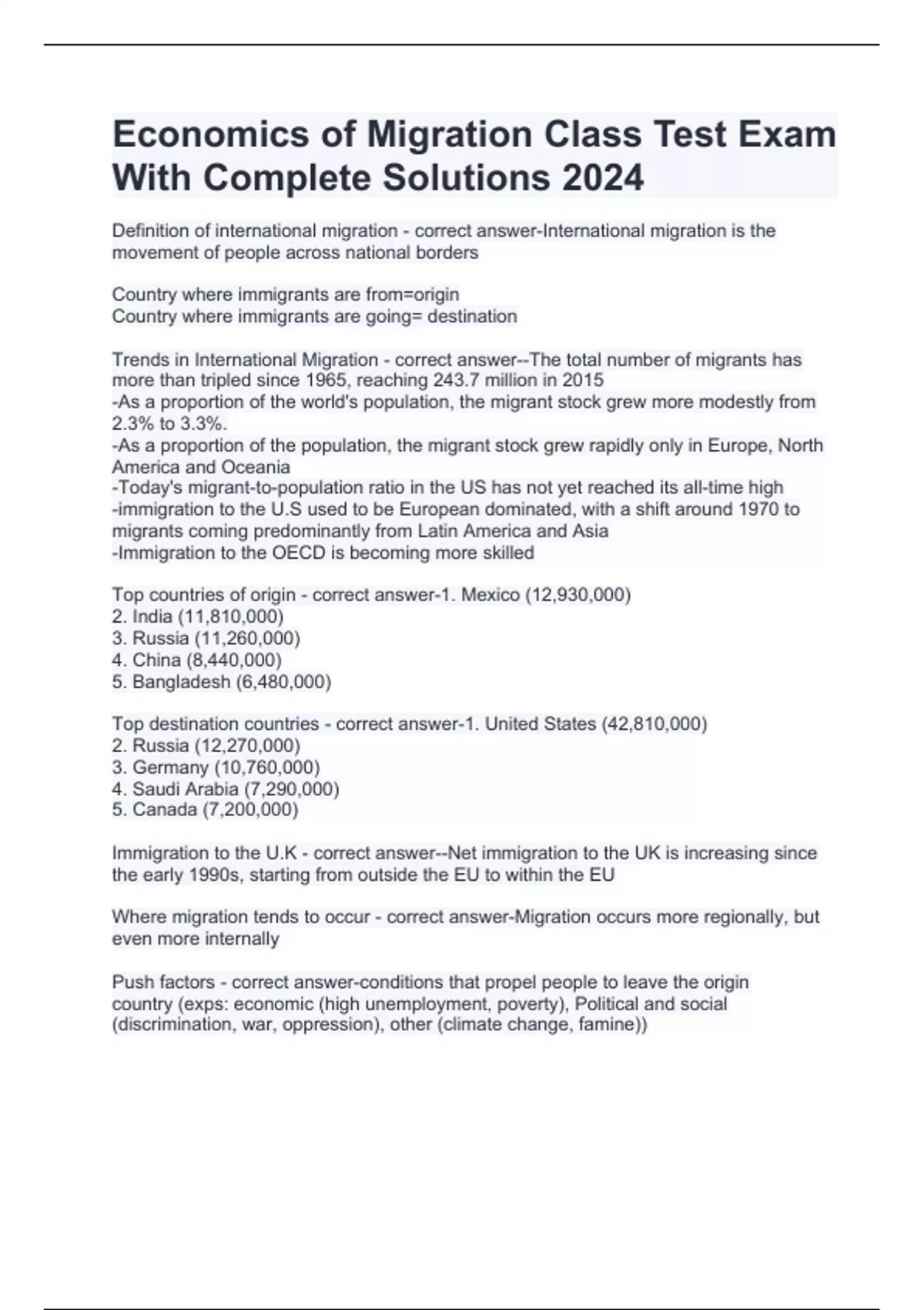 Economics of Migration Class Test Exam With Complete Solutions 2024