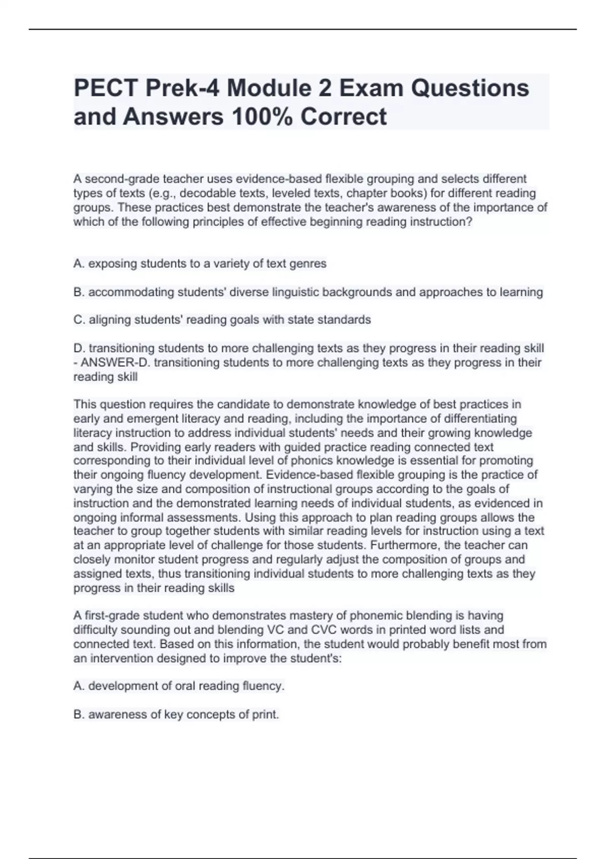 PECT Prek-4 Module 2 Exam Questions and Answers 100% CorrectPECT Prek-4 Module 2 Exam Questions and Answers 100% CorrectPECT Prek-4 Module 2 Exam Questions and Answers 100% Correct A second-grade teacher uses evidence-based flexible grouping and selects different types of texts (e.g., decodable texts, leveled texts, chapter books) for different reading groups. These practices best demonstrate the teacher's awareness of the importance of which of the following principles of effective beginning reading instruction? A. exposing students to a variety of text genres B. accommodating students' diverse linguistic backgrounds and approaches to learning C. aligning students' reading goals with state standards D. transitioning students to more challenging texts as they progress in their reading skill - ANSWER-D. transitioning students to more challenging texts as they progress in their reading skill This question requires the candidate to demonstrate knowledge of best practices in early and emergent literacy and reading, including the importance of differentiating literacy instruction to address individual students' needs and their growing knowledge and skills. Providing early readers with guided practice reading connected text corresponding to their individual level of phonics knowledge is essential for promoting their ongoing fluency development. Evidence-based flexible grouping is the practice of varying the size and composition of instructional groups according to the goals of