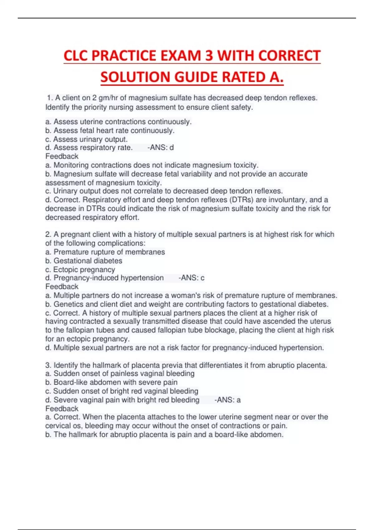 CLC PRACTICE EXAM 3 WITH CORRECT SOLUTION GUIDE RATED A.