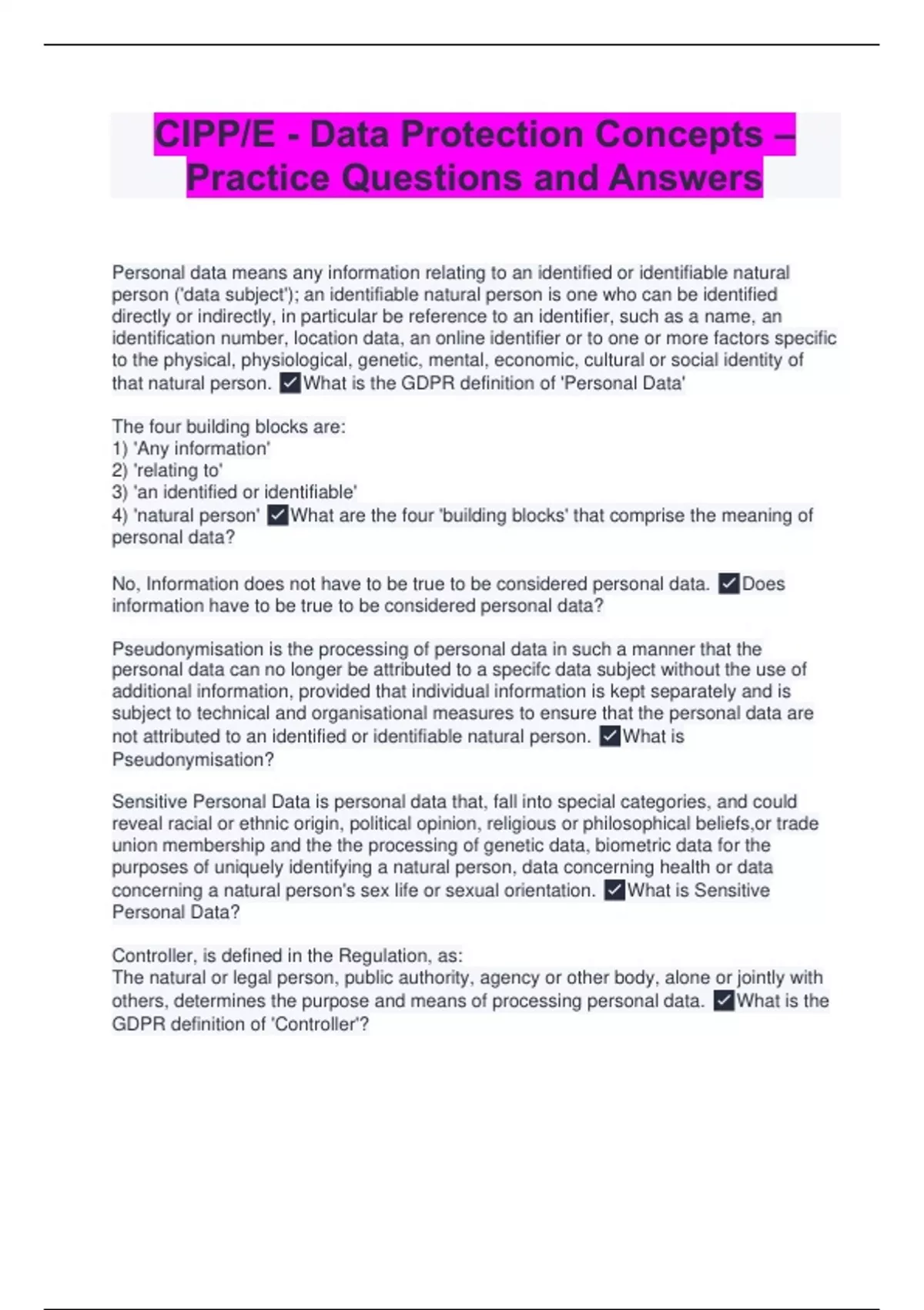 Personal data means any information relating to an identified or identifiable natural person ('data subject'); an identifiable natural person is one who can be identified directly or indirectly, in particular be reference to an identifier, such as a name, an identification number, location data, an online identifier or to one or more factors specific to the physical, physiological, genetic, mental, economic, cultural or social identity of that natural person. What is the GDPR definition of 'Personal Data' The four building blocks are: 1) 'Any information' 2) 'relating to' 3) 'an identified or identifiable' 4) 'natural person' What are the four 'building blocks' that comprise the meaning of personal data? No, Information does not have to be true to be considered personal data. Does information have to be true to be considered personal data? Pseudonymisation is the processing of personal data in such a manner that the personal data can no longer be attributed to a specifc data subject without the use of additional information, provided that individual information is kept separately and is subject to technical and organisational measures to ensure that the personal data are not attributed to an identified or identifiable natural person. What is Pseudonymisation? Sensitive Personal Data is personal data that, fall into special categories, and could reveal racial or ethnic origin, political opinion, religious or philosophical beliefs,or trade union membership and the the processing of genetic data, biometric data for the purposes of uniquely identifying a natural person, data concerning health or data concerning a natural person's sex life or sexual orientation. What is Sensitive Personal Data? Controller, is defined in the Regulation, as: The natural or legal person, public authority, agency or other body, alone or jointly with others, determines the purpose and means of processing personal data. What is the GDPR definition of 'Controller'?