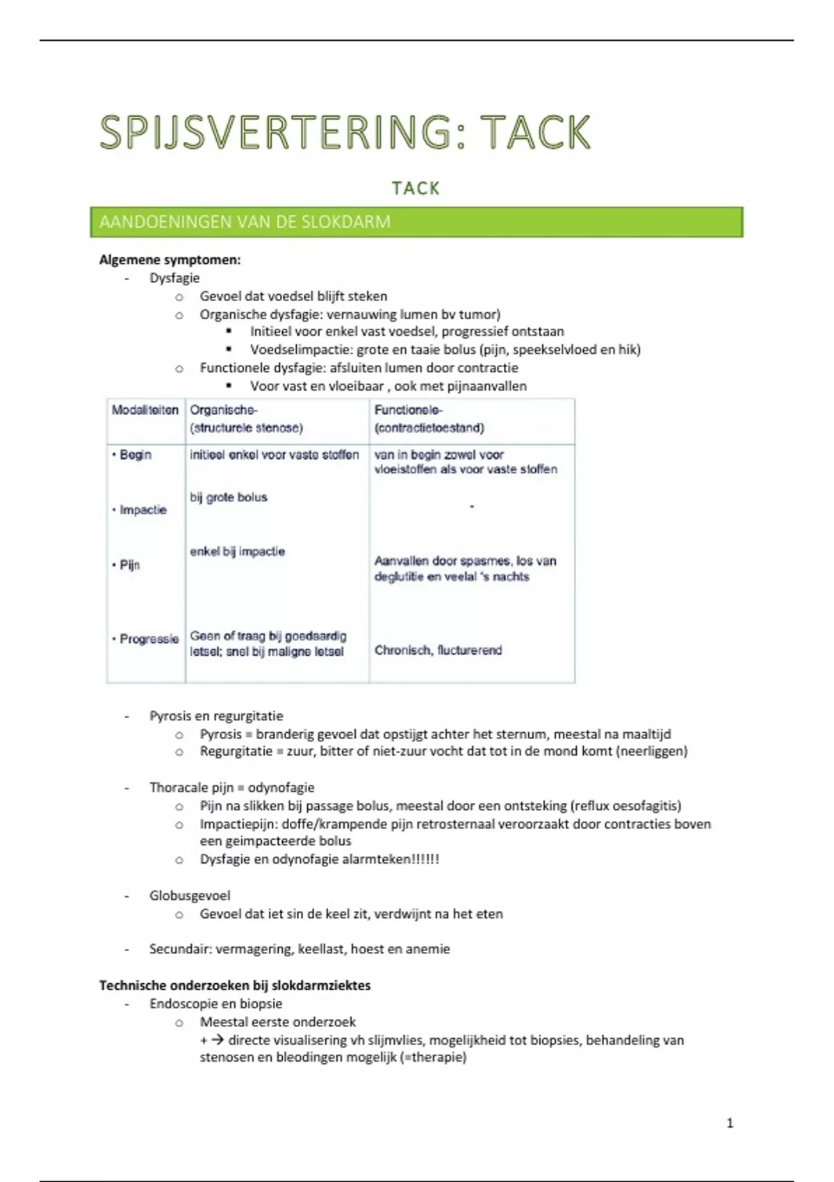 Deze samenvatting bevat de lessen die gegeven zijn door Prof. Tack voor het vak spijsvertering in de 1ste master geneeskunde. Het is gebaseerd op de slides van de lessen en de bijbehorende hoofdstukken in het boek. De samenvatting legt vooral de focus op de besproken pathologiën.