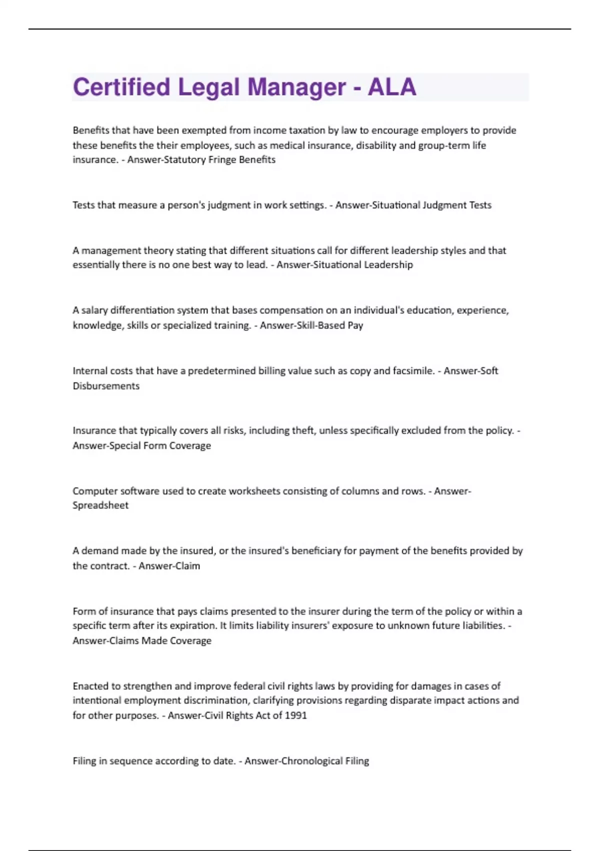 Certified Legal Manager - ALA | Questions with 100% correct answers | verified