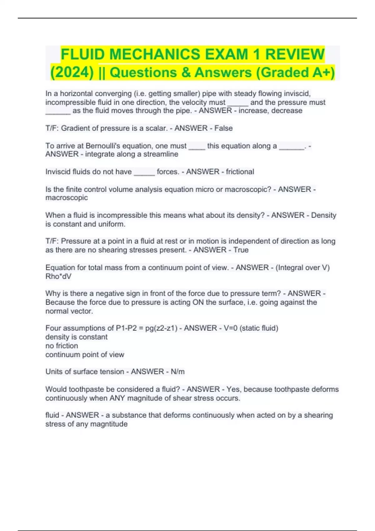 FLUID MECHANICS EXAM 1 REVIEW (2024) || Questions & Answers (Graded A+) FLUID MECHANICS EXAM 1 REVIEW (2024) || Questions & Answers (Graded A+) In a horizontal converging (i.e. getting smaller) pipe with steady flowing inviscid, incompressible fluid in one direction, the velocity must _____ and the pressure must ______ as the fluid moves through the pipe. - ANSWER - increase, decrease T/F: Gradient of pressure is a scalar. - ANSWER - False To arrive at Bernoulli's equation, one must ____ this equation along a ______. - ANSWER - integrate along a streamline Inviscid fluids do not have _____ forces. - ANSWER - frictional Is the finite control volume analysis equation micro or macroscopic? - ANSWER - macroscopic When a fluid is incompressible this means what about its density? - ANSWER - Density is constant and uniform. T/F: Pressure at a point in a fluid at rest or in motion is independent of direction as long as there are no shearing stresses present. - ANSWER - True Equation for total mass from a continuum point of view. - ANSWER - (Integral over V) Rho*dV Why is there a negative sign in front of the force due to pressure term? - ANSWER - Because the force due to pressure is acting ON the surface, i.e. going against the normal vector. Four assumptions of P1-P2 = pg(z2-z1) - ANSWER - V=0 (static fluid) density is constant no friction continuum point of view Units of surface tension - ANSWER - N/m Would toothpaste be considered a fluid? - ANSWER - Yes, because toothpaste deforms continuously when ANY magnitude of shear stress occurs. fluid - ANSWER - a substance that deforms continuously when acted on by a shearing stress of any magntitude