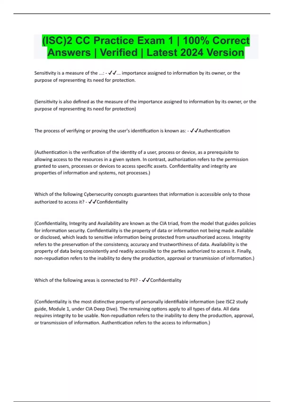 Sensitivity is a measure of the ...: - ... importance assigned to information by its owner, or the purpose of representing its need for protection. (Sensitivity is also defined as the measure of the importance assigned to information by its owner, or the purpose of representing its need for protection) The process of verifying or proving the user's identification is known as: - Authentication (Authentication is the verification of the identity of a user, process or device, as a prerequisite to allowing access to the resources in a given system. In contrast, authorization refers to the permission granted to users, processes or devices to access specific assets. Confidentiality and integrity are properties of information and systems, not processes.) Which of the following Cybersecurity concepts guarantees that information is accessible only to those authorized to access it? - Confidentiality (Confidentiality, Integrity and Availability are known as the CIA triad, from the model that guides policies for information security. Confidentiality is the property of data or information not being made available or disclosed, which leads to sensitive information being protected from unauthorized access. Integrity refers to the preservation of the consistency, accuracy and trustworthiness of data. Availability is the property of data being consistently and readily accessible to the parties authorized to access it. Finally, non-repudiation refers to the inability to deny the production, approval or transmission of information.) Which of the following areas is connected to PII? - Confidentiality