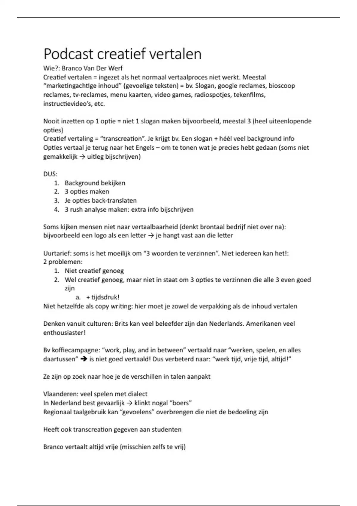Met deze samenvatting behaalde ik 18/20 in eerste zit! Dit document is een samenvatting van de podcast 'creatief vertalen' die we voor het vak Inleiding tot de Vertaalkunde moesten luisteren en kennen.