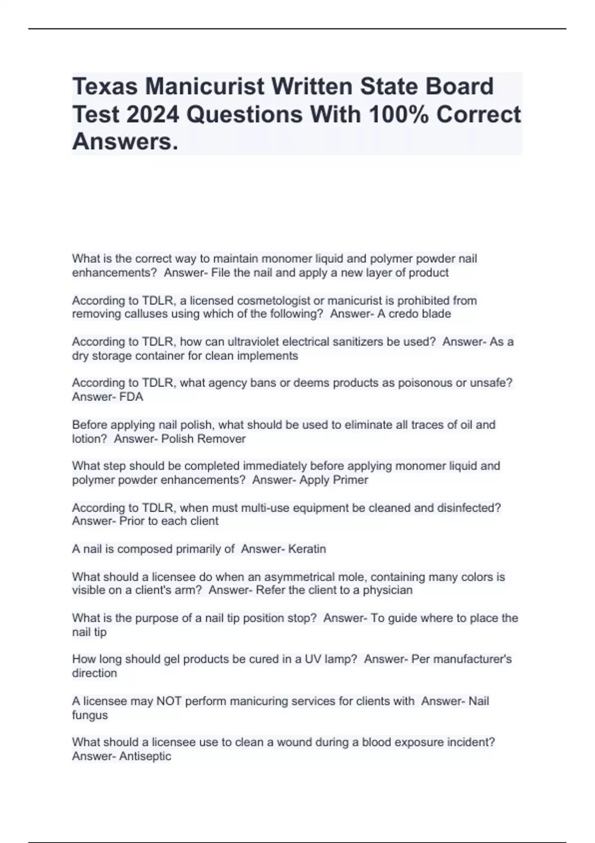 Texas Manicurist Written State Board Test 2024 Questions With 100% Correct Answers.
