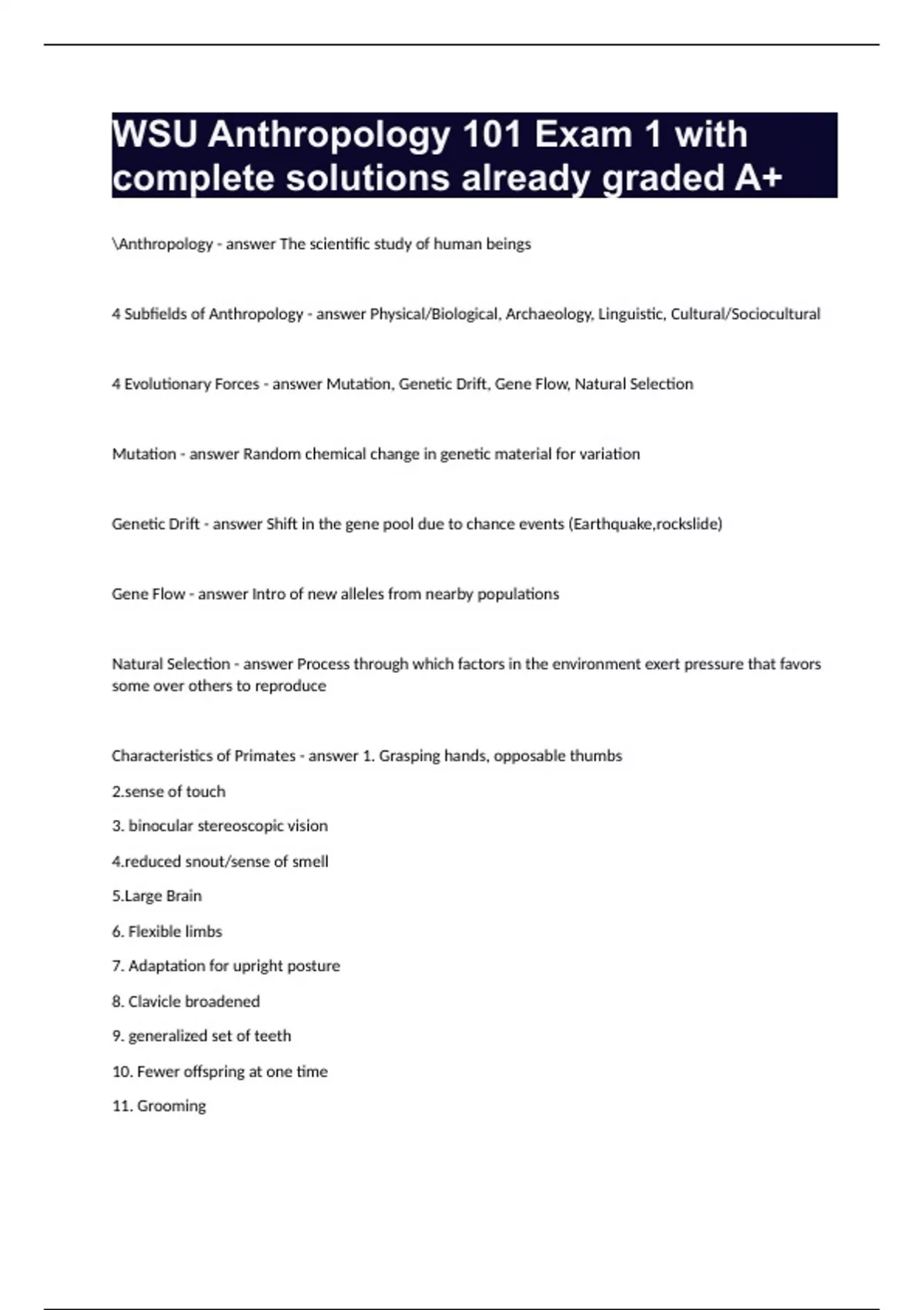 WSU Anthropology 101 Exam 1 with complete solutions already graded A+
