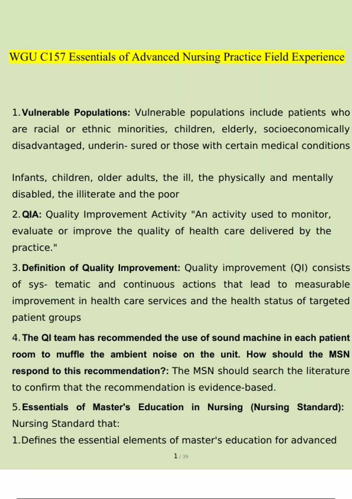 WGU C157 Essentials of Advanced Nursing Practice Field Experience 1. Vulnerable Populations: Vulnerable populations include patients who are racial or ethnic minorities, children, elderly, socioeconomically disadvantaged, underin- sured or those with certain medical conditions Infants, children, older adults, the ill, the physically and mentally disabled, the illiterate and the poor 2. QIA: Quality Improvement Activity "An activity used to monitor, evaluate or improve the quality of health care delivered by the practice." 3. Definition of Quality Improvement: Quality improvement (QI) consists of sys- tematic and continuous actions that lead to measurable improvement in health care services and the health status of targeted patient groups 4. The QI team has recommended the use of sound machine in each patient room to muffle the ambient noise on the unit. How should the MSN respond to this recommendation?: The MSN should search the literature to confirm that the recommendation is evidence-based. 5. Essentials of M