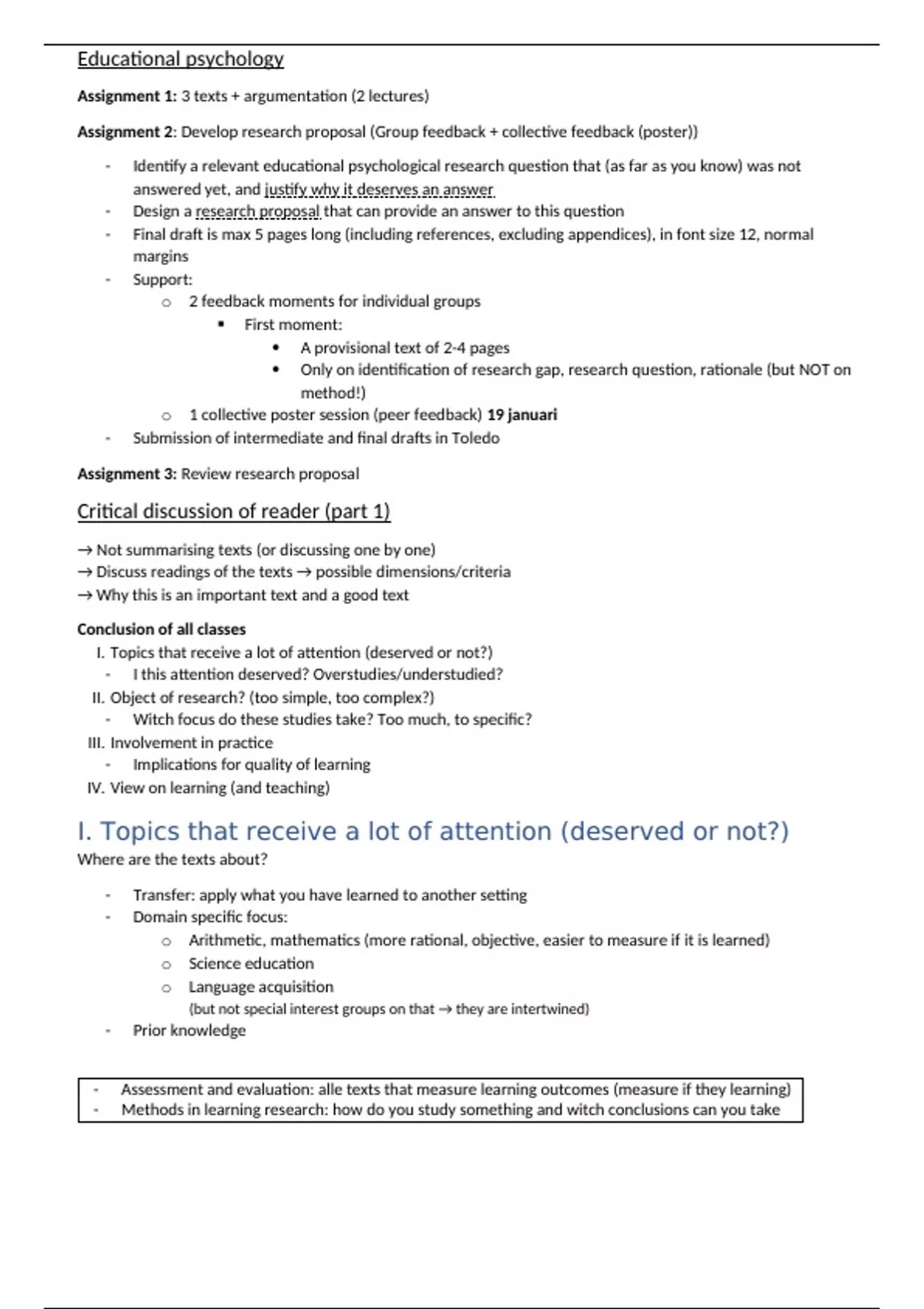 - Assessment and evaluation: alle texts that measure learning outcomes (measure if they learning)