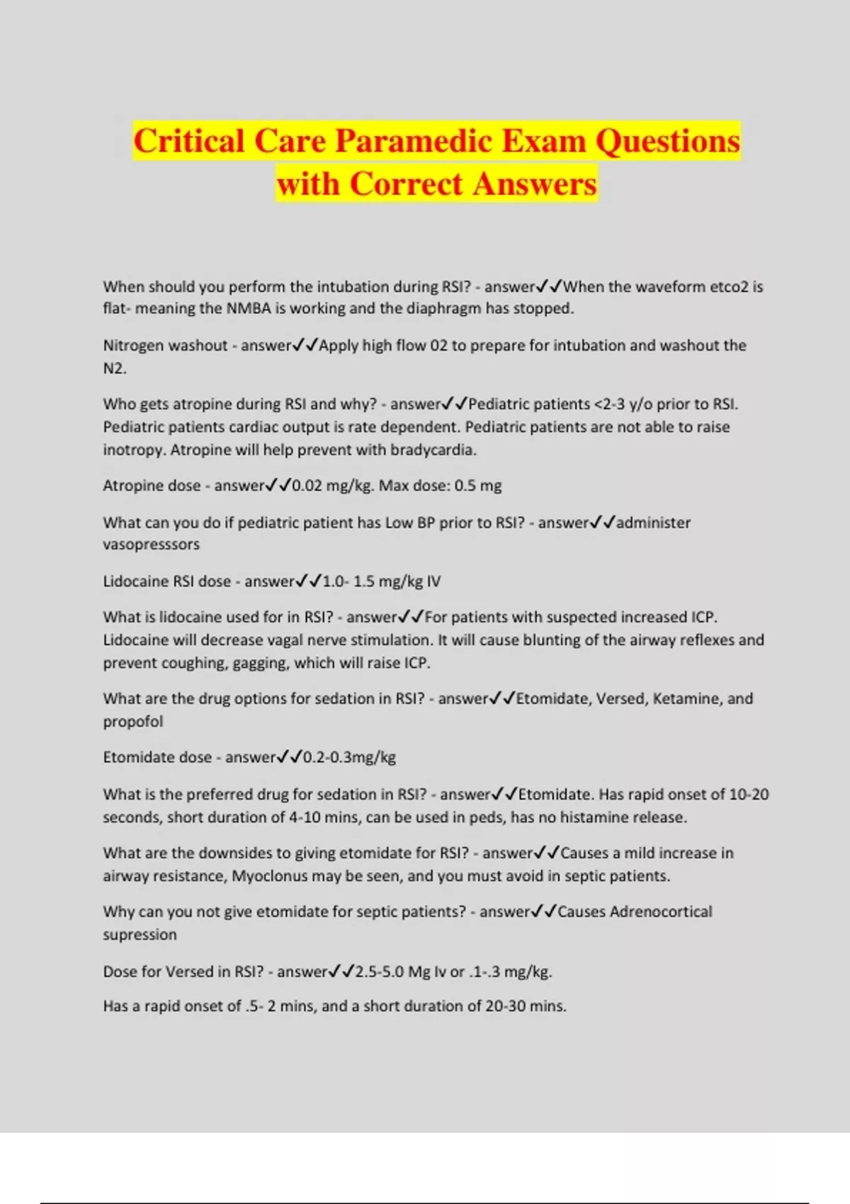 Critical Care Paramedic Exam Questions with Correct Answers When should you perform the intubation during RSI? - answerWhen the waveform etco2 is flat- meaning the NMBA is working and the diaphragm has stopped. Nitrogen washout - answerApply high flow 02 to prepare for intubation and washout the N2. Who gets atropine during RSI and why? - answerPediatric patients <2-3 y/o prior to RSI. Pediatric patients cardiac output is rate dependent. Pediatric patients are not able to raise inotropy. Atropine will help prevent with bradycardia. Atropine dose - answer0.02 mg/kg. Max dose: 0.5 mg What can you do if pediatric patient has Low BP prior to RSI? - answeradminister vasopresssors Lidocaine RSI dose - answer1.0- 1.5 mg/kg IV What is lidocaine used for in RSI? - answerFor patients with suspected increased ICP. Lidocaine will decrease vagal nerve stimulation. It will cause blunting of the airway reflexes and prevent coughing, gagging, which will raise ICP. What are the drug options for sedation in RSI? - answerEtomidate, Versed, Ketamine, and propofol Etomidate dose - answer0.2-0.3mg/kg What is the preferred drug for sedation in RSI? - answerEtomidate. Has rapid onset of 10-20 seconds, short duration of 4-10 mins, can be used in peds, has no histamine release. What are the downsides to giving etomidate for RSI? - answerCauses a mild increase in airway resistance, Myoclonus may be seen, and you must avoid in septic patients. Why can you not give etomidate for septic patients? - answerCauses Adrenocortical supression Dose for Versed in RSI? - answer2.5-5.0 Mg Iv or .1-.3 mg/kg. Has a rapid onset of .5- 2 mins, and a short duration of 20-30 mins.