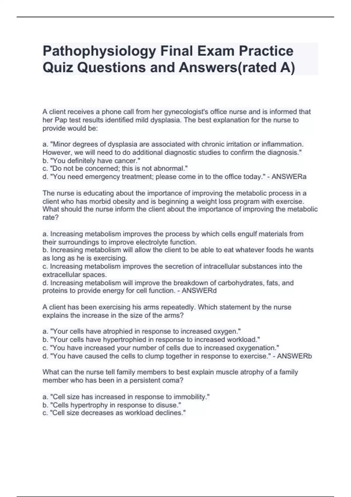 Pathophysiology Final Exam Practice Quiz QA client receives a phone call from her gynecologist's office nurse and is informed that her Pap test results identified mild dysplasia. The best explanation for the nurse to provide would be: a. "Minor degrees of dysplasia are associated with chronic irritation or inflammation. However, we will need to do additional diagnostic studies to confirm the diagnosis." b. "You definitely have cancer." c. "Do not be concerned; this is not abnormal." d. "You need emergency treatment; please come in to the office today." - ANSWERa The nurse is educating about the importance of improving the metabolic process in a client who has morbid obesity and is beginning a weight loss program with exercise. What should the nurse inform the client about the importance of improving the metabolic rate? a. Increasing metabolism improves the process by which cells engulf materials from their surroundings to improve electrolyte function. b. Increasing metabolism will allow the client to be able to eat whatever foods he wants as long as he is exercising. c. Increasing metabolism improves the secretion of intracellular substances into the extracellular spaces. d. Increasing metabolism will improve the breakdown of carbohydrates, fats, and proteins to provide energy for cell function. - ANSWERd A client has been exercising his arms repeatedly. Which statement by the nurse explains the increase in the size of the arms? a. "Your cells have atrophied in response to increased oxygen." b. "Your cells have hypertrophied in response to increased workload." c. "You have increased your number of cells due to increased oxygenation." d. "You have caused the cells to clump together in response to exercise." - ANSWERb What can the nurse tell family members to best explain muscle atrophy of a family member who has been in a persistent coma? a. "Cell size has increased in response to immobility." b. "Cells hypertrophy in response to disuse." c. "Cell size decreases as workload declines." d. "Cells need more oxygen the longer they are immobile." - ANSWERc Which statement would a nurse tell a client to best describe apoptosis? a. "Apoptosis describes increase in number of cells." b. "Apoptosis occurs in irreversibly damaged cells." c. "Apoptosis is an increase in the size of cells." d. "Apoptosis is the natural removal of injured or worn out cells." - ANSWERd The student nurse is removing sutures on client after abdominal surgery, and the wound begins to pull apart. The student asks the instructor, "Did I do something wrong?" The instructor reviews wound healing and replies: a. "Maybe the wound edges were not close enough together to allow epithelialization of the wound to occur." b. "Maybe the client was 'picking' at the wound and caused the edges to not be well-approximated." c. "Maybe you were a little rough when you pulled out the sutures." d. "Maybe the sutures were left in too long and impeded healing." - ANSWERa uestions and Answers(rated A)