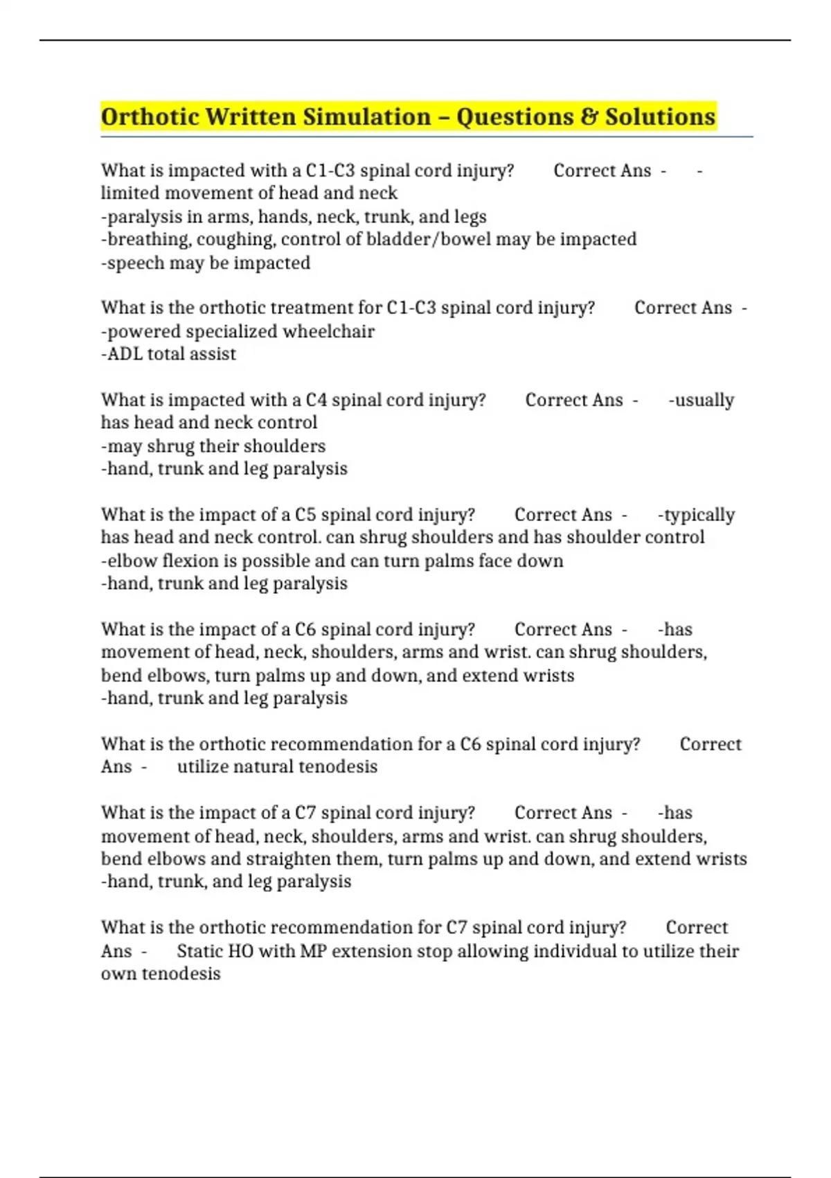 What is the orthotic recommendation for C7 spinal cord injury? Correct