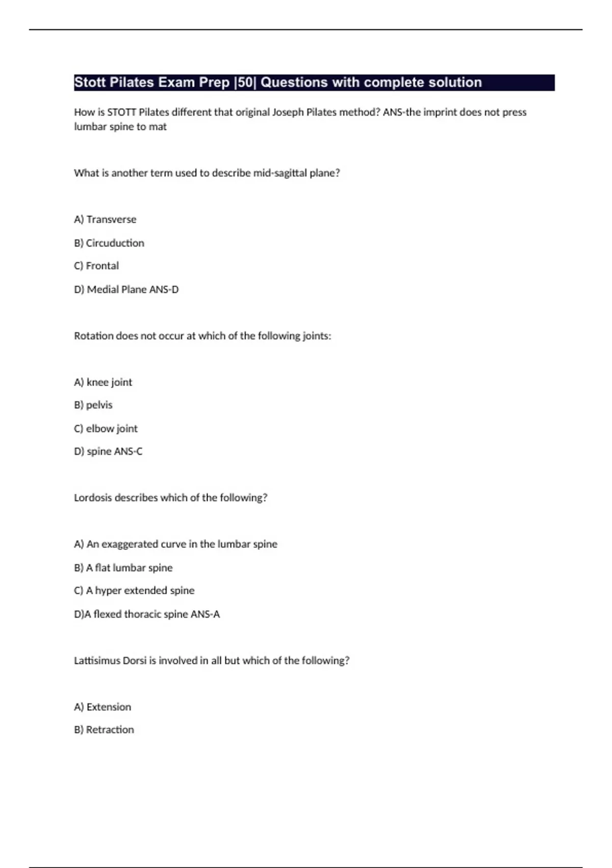 Stott Pilates Exam Prep |50| Questions with complete solution How is STOTT Pilates different that original Joseph Pilates method? ANS-the imprint does not press lumbar spine to mat What is another term used to describe mid-sagittal plane? A) Transverse B) Circuduction C) Frontal D) Medial Plane ANS-D Rotation does not occur at which of the following joints: A) knee joint B) pelvis C) elbow joint D) spine ANS-C Lordosis describes which of the following? A) An exaggerated curve in the lumbar spine B) A flat lumbar spine C) A hyper extended spine D)A flexed thoracic spine ANS-A Lattisimus Dorsi is involved in all but which of the following? A) Extension B) Retraction C) Medially Rotates D) Flexion ANS-D Lattismus Dorsi assists in forced expiration? A) True B) False ANS-A Which muscle flexes the knee and extends the hip? A) Rectus Femoris B) Semimembranousous C) Semitendinous D Bicepts Femoris ANS-D Which muscle protracts the scapula? A) Latissumus Dorsi B) Serratus Anterior C) Rhomboids D) Mid Trapezius ANS-B Which joint involv