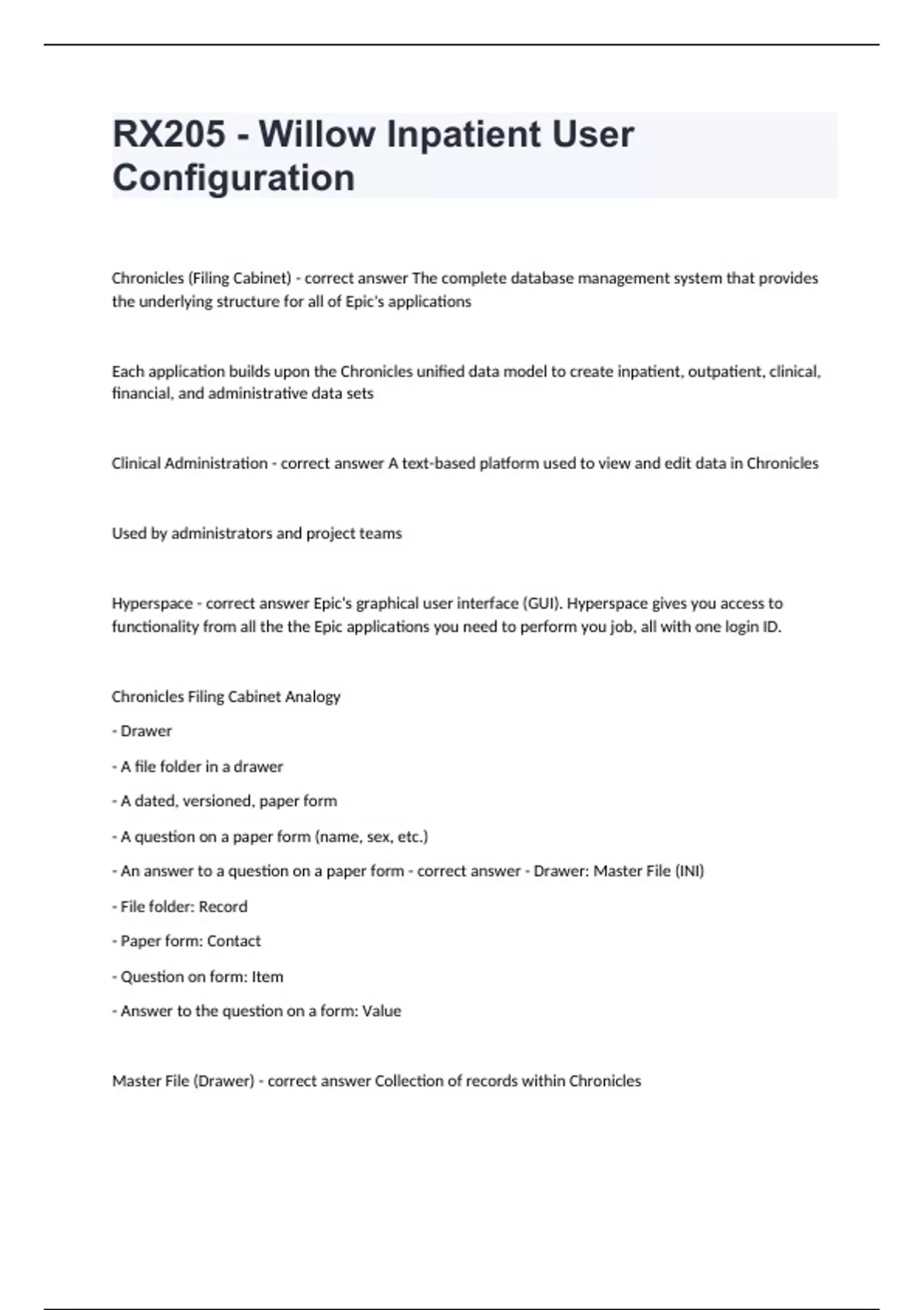 Chronicles (Filing Cabinet) - correct answer The complete database management system that provides the underlying structure for all of Epic's applications Each application builds upon the Chronicles unified data model to create inpatient, outpatient, clinical, financial, and administrative data sets Clinical Administration - correct answer A text-based platform used to view and edit data in Chronicles Used by administrators and project teams Hyperspace - correct answer Epic's graphical user interface (GUI). Hyperspace gives you access to functionality from all the the Epic applications you need to perform you job, all with one login ID. Chronicles Filing Cabinet Analogy - Drawer - A file folder in a drawer - A dated, versioned, paper form - A question on a paper form (name, sex, etc.) - An answer to a question on a paper form - correct answer - Drawer: Master File (INI) - File folder: Record - Paper form: Contact - Question on form: Item - Answer to the question on a form: Value Master File (Drawer) - correct answer Collection of records within Chronicles Examples: - Medication (ERX) - Package (NDC) - Pharmacy (PHR) Record (File Folder) - correct answer Records within a master file Examples: - ACETAMINOPHEN 325 MG PO TABS - FUROSEMIDE 10MG/ML PO SOLN Contacts (dated sheets of paper) - correct answer Example: New Medication Load Items & Values (Questions & Answers) - correct answer Examples: - Dispense code: Unit Dose - Order display name: furosemide (LASIX) injection Master files contain __________. If you compare two records in the same master file, you find that the _________ are the same, but the _________ can be different - correct answer Records, items, values Facility Structure: -Facility -Service Area -Location -Department -Room/Bed - correct answer -Facility: The entire organization (enterprise) -Service area: A region or business entity within your organization, for grouping revenue flow -Location: A hospital or free-standing clinic -Department: Where a patient is scheduled for an appointment or is admitted; where a user works - Room/Bed: In a hospital unit, specifically where a patient is admitted Category List & Category Value - correct answer List: A group of possible values for a given item i.e., Ethnic Group or Marital Status Value: an item within a list that a user can select i.e., African American or Single Category List Address in Hyperspace & Clinical Admin. - correct answer Hyperspace - keystroke: CTRL + left click on a category list A category address is what pops up (i.e., EPT140) Clinical Admin - HOME then F8 takes you to the address (i.e., find a provider in text, navigate to Provider Type, press HOME+F8 and it takes you to the item & record window - from here the INI and item # is the address - SER1041) INI - correct answer Master file List Examples of Departments - Outpatient -ADU Unit - Hospital Outpatient - Virtual - correct answer - Outpatient: AVH Family Medicine, AVH Cardiology -ADU Unit: PCU, ICU, OB/NUR, ED - Hospital Outpatient: AVH SDS, AVH Oncology Infusion - Virtual: AVH Pharmacy, AVH Respiratory Therapy Dynamic Master Files - correct answer Has records that are built and updated by users as they work in the system, like the Patient (EPT) or Orders (ORD) master files Static Master Files - correct answer Has records that are built and updated by the administrators, like the Medication (ERX) or Provider (SER) master files User (EMP) record - correct answer A record built for users within Epic - this contains their name, login, password, and security settings User template - correct answer Another type of record in the EMP master file. A template contains settings needed for a group of users with a particular job. I.e., Willow Inpatient Pharmacist - Settings shared by all users with this template - What users see, can do in Epic What is the purpose of User templates? - correct answer - Easier than creating (and maintaining) settings in individual User (EMP) records - Applies appropriate settings for users with the same job role such as an Inpatient Pharmacist (i.e., User Roles, EpicCare Inpatient, Willow, etc.) - Once you apply a template, settings controlled by the template are disabled (grayed-out) in the User (EMP) record and the value from the template is displayed -Provides default security settings and a default login department