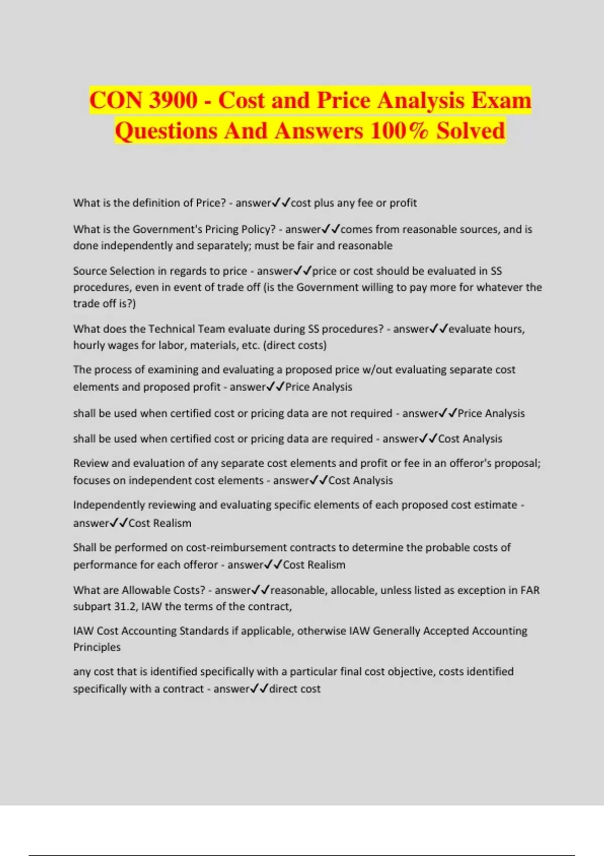 CON 3900 - Cost and Price Analysis Exam Questions And Answers 100% Solved What is the definition of Price? - answercost plus any fee or profit What is the Government's Pricing Policy? - answercomes from reasonable sources, and is done independently and separately; must be fair and reasonable Source Selection in regards to price - answerprice or cost should be evaluated in SS procedures, even in event of trade off (is the Government willing to pay more for whatever the trade off is?) What does the Technical Team evaluate during SS procedures? - answerevaluate hours, hourly wages for labor, materials, etc. (direct costs) The process of examining and evaluating a proposed price w/out evaluating separate cost elements and proposed profit - answerPrice Analysis shall be used when certified cost or pricing data are not required - answerPrice Analysis shall be used when certified cost or pricing data are required - answerCost Analysis Review and evaluation of any separate cost elements and profit or fee in an offeror's proposal; focuses on independent cost elements - answerCost Analysis Independently reviewing and evaluating specific elements of each proposed cost estimate - answerCost Realism Shall be performed on cost-reimbursement contracts to determine the probable costs of performance for each offeror - answerCost Realism What are Allowable Costs? - answerreasonable, allocable, unless listed as exception in FAR subpart 31.2, IAW the terms of the contract, IAW Cost Accounting Standards if applicable, otherwise IAW Generally Accepted Accounting Principles any cost that is identified specifically with a particular final cost objective, costs identified specifically with a contract - answerdirect cost