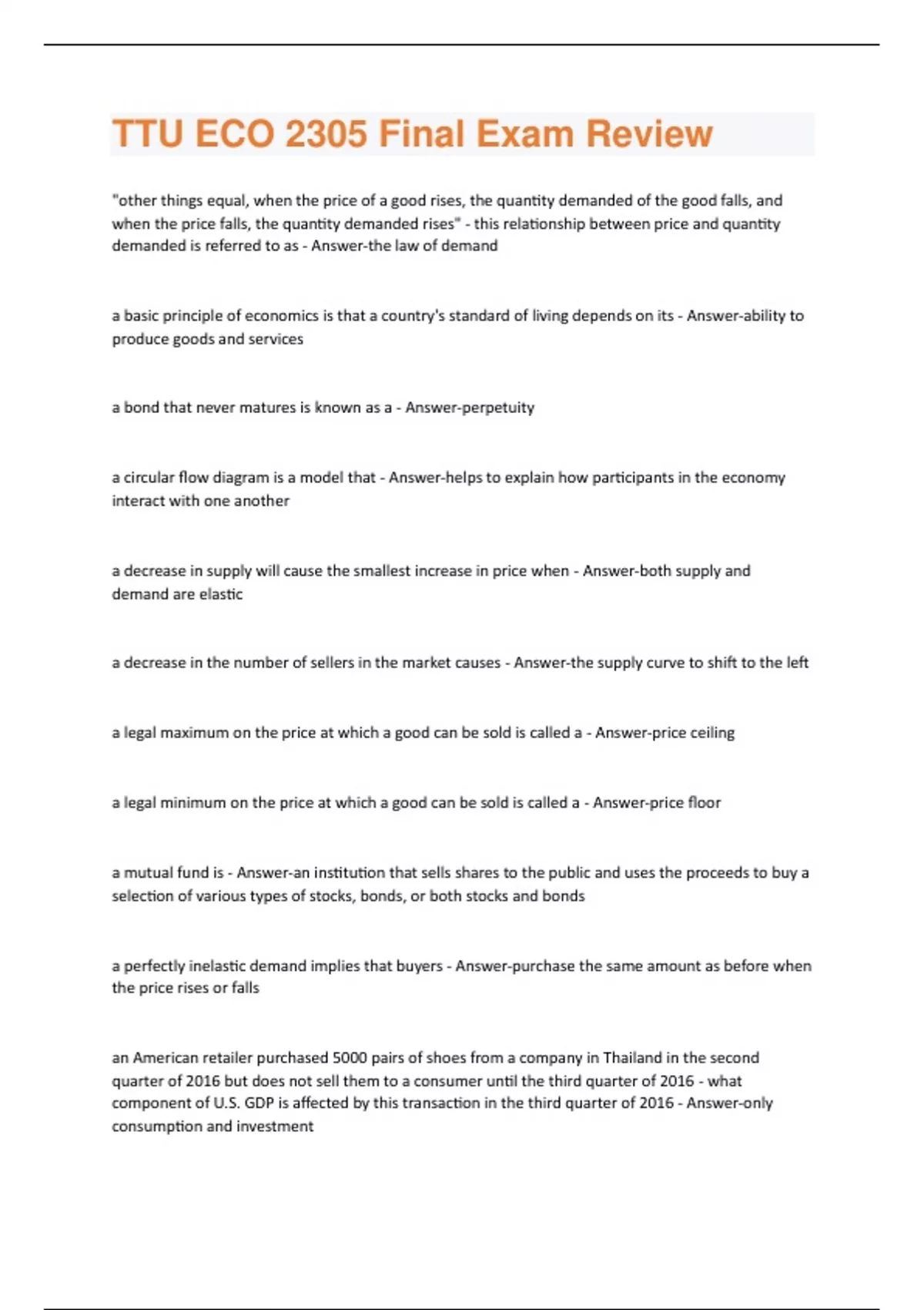 TTU ECO 2305 Final Exam Review Questions and Answers(A+ Solution guide)