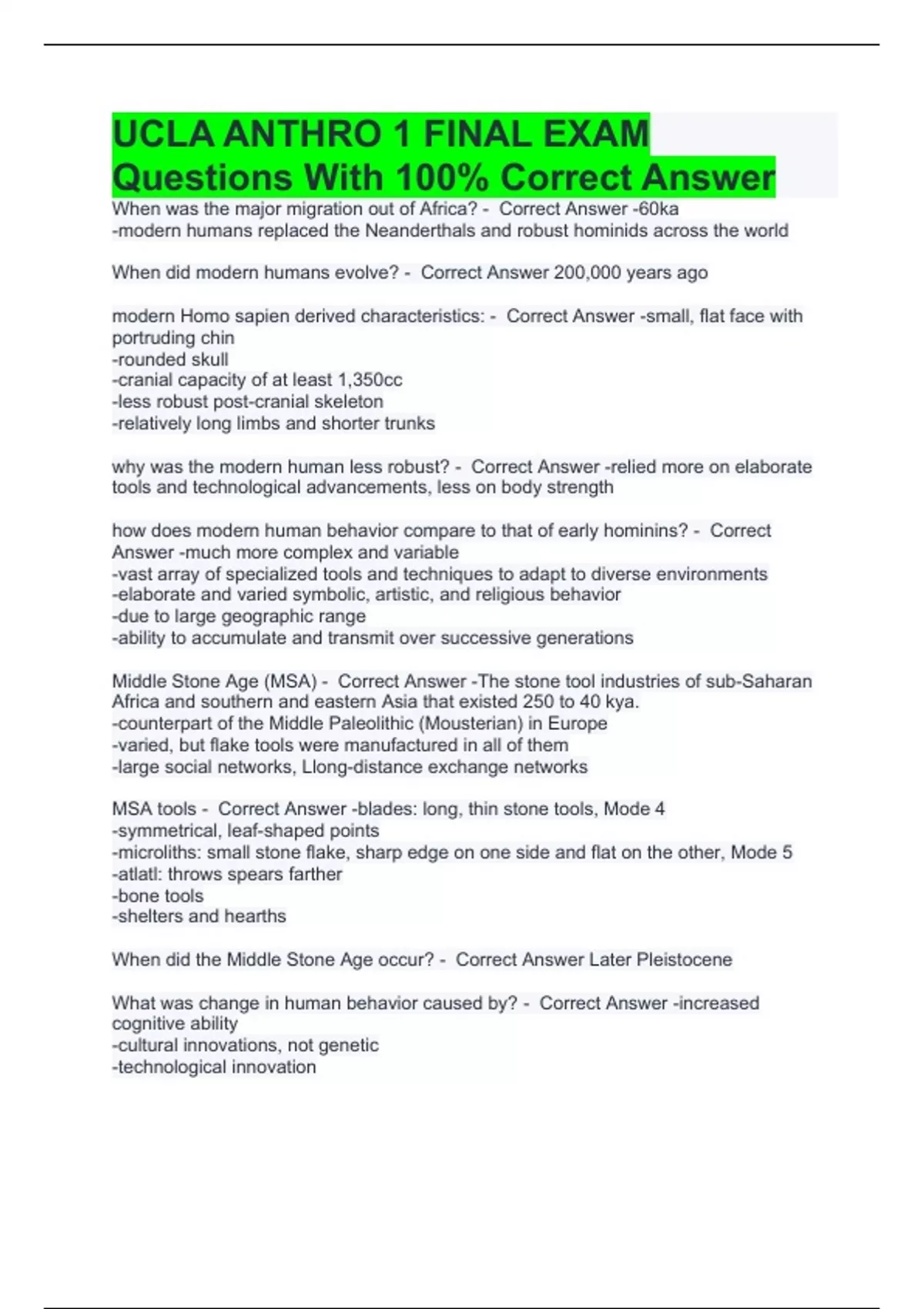 When was the major migration out of Africa? - Correct Answer -60ka -modern humans replaced the Neanderthals and robust hominids across the world When did modern humans evolve? - Correct Answer 200,000 years ago modern Homo sapien derived characteristics: - Correct Answer -small, flat face with portruding chin -rounded skull -cranial capacity of at least 1,350cc -less robust post-cranial skeleton -relatively long limbs and shorter trunks why was the modern human less robust? - Correct Answer -relied more on elaborate tools and technological advancements, less on body strength how does modern human behavior compare to that of early hominins? - Correct Answer -much more complex and variable -vast array of specialized tools and techniques to adapt to diverse environments -elaborate and varied symbolic, artistic, and religious behavior -due to large geographic range -ability to accumulate and transmit over successive generations Middle Stone Age (MSA) - Correct Answer -The stone tool industries of sub-Saharan Africa and southern and eastern Asia that existed 250 to 40 kya. -counterpart of the Middle Paleolithic (Mousterian) in Europe -varied, but flake tools were manufactured in all of them -large social networks, Llong-distance exchange networks MSA tools - Correct Answer -blades: long, thin stone tools, Mode 4 -symmetrical, leaf-shaped points -microliths: small stone flake, sharp edge on one side and flat on the other, Mode 5 -atlatl: throws spears farther -bone tools -shelters and hearths When did the Middle Stone Age occur? - Correct Answer Later Pleistocene What was change in human behavior caused by? - Correct Answer -increased cognitive ability -cultural innovations, not genetic -technological innovation MSA transition - Correct Answer technological innovation --> more efficient food acquisition --> greater economic surplus --> more economic specialization --> greater symbolic and ritual activity Fossil Evidence for movement out of Africa - Correct Answer -earliest found in China, 120-80ka -no other anatomical modern fossil outside Africa that date to before 63ka - beginning 30ka, wealth of evidence for presence of modern humans across Europe Genetic Evidence for movement out of Africa - Correct Answer 1) modern humans evolved in Africa btw 200-90ka 2) modern humans outside Africa are descended from one or more populations that left Africa btw 120-40ka 3) a small amount of interbreeding occurred btw modern humans and hominins already living in Eurasia (Neanderthals and Denisovans) What kind of DNA does not undergo recombination, thus allowing you to trace it back to a single individual? - Correct Answer 1) DNA on Y chromosom 2) mitochondria DNA from mom 3) short segments of DNA on ordinary chromosomes What does the accumulation of mutations allow us to discover? - Correct Answer -estimate time passed since the MRCA -estimate past population size Relationship between distance from Africa and genetic variation - Correct Answer increased distance from Africa = decreased genetic variation Why does the genetic variation decrease? - Correct Answer - each time people leave a population, they carry with them only a subset of genes present within that population polygyny threshold model - Correct Answer An explanation for polygyny based on the premise