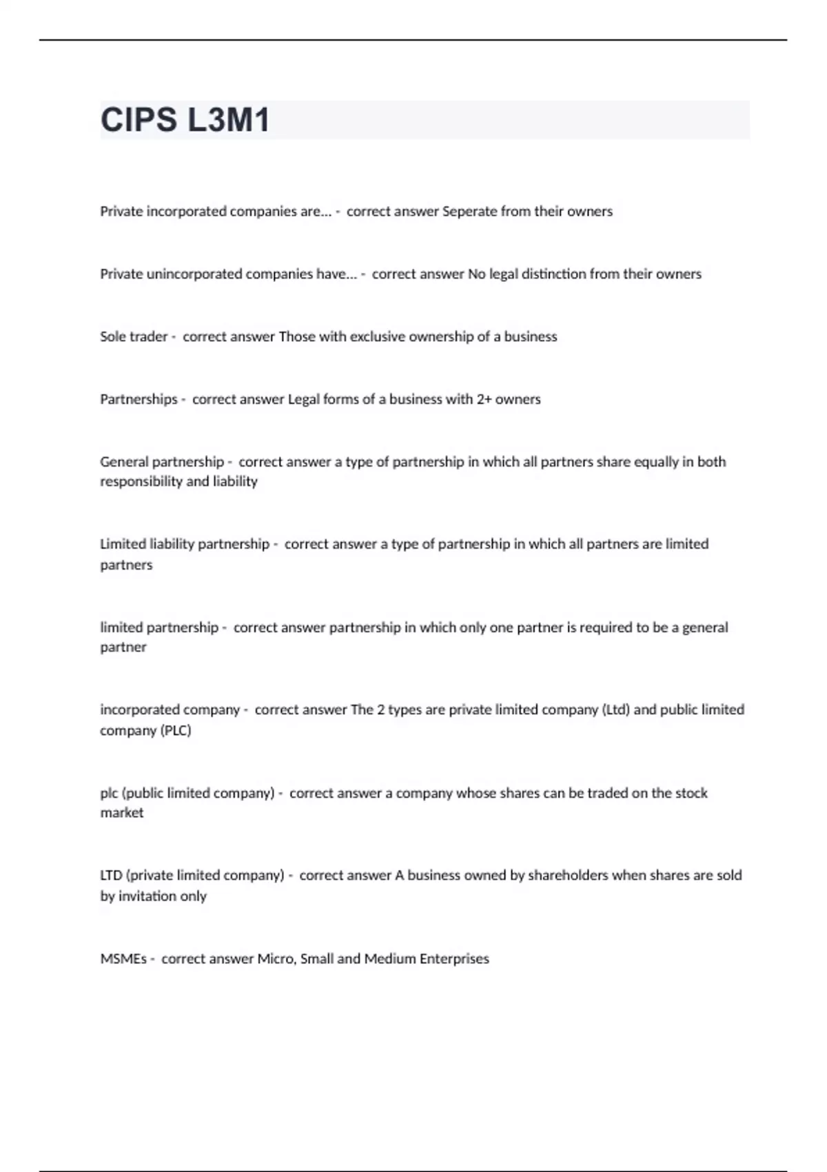 CIPS L3M1 questions well answered graded A+ 2024/2025Private incorporated companies are... - correct answer Seperate from their owners Private unincorporated companies have... - correct answer No legal distinction from their owners Sole trader - correct answer Those with exclusive ownership of a business Partnerships - correct answer Legal forms of a business with 2+ owners General partnership - correct answer a type of partnership in which all partners share equally in both responsibility and liability Limited liability partnership - correct answer a type of partnership in which all partners are limited partners limited partnership - correct answer partnership in which only one partner is required to be a general partner incorporated company - correct answer The 2 types are private limited company (Ltd) and public limited company (PLC) plc (public limited company) - correct answer a company whose shares can be traded on the stock market LTD (private limited company) - correct answer A business owned by shareholders when shares are sold by invitation only MSMEs - correct answer Micro, Small and Medium Enterprises