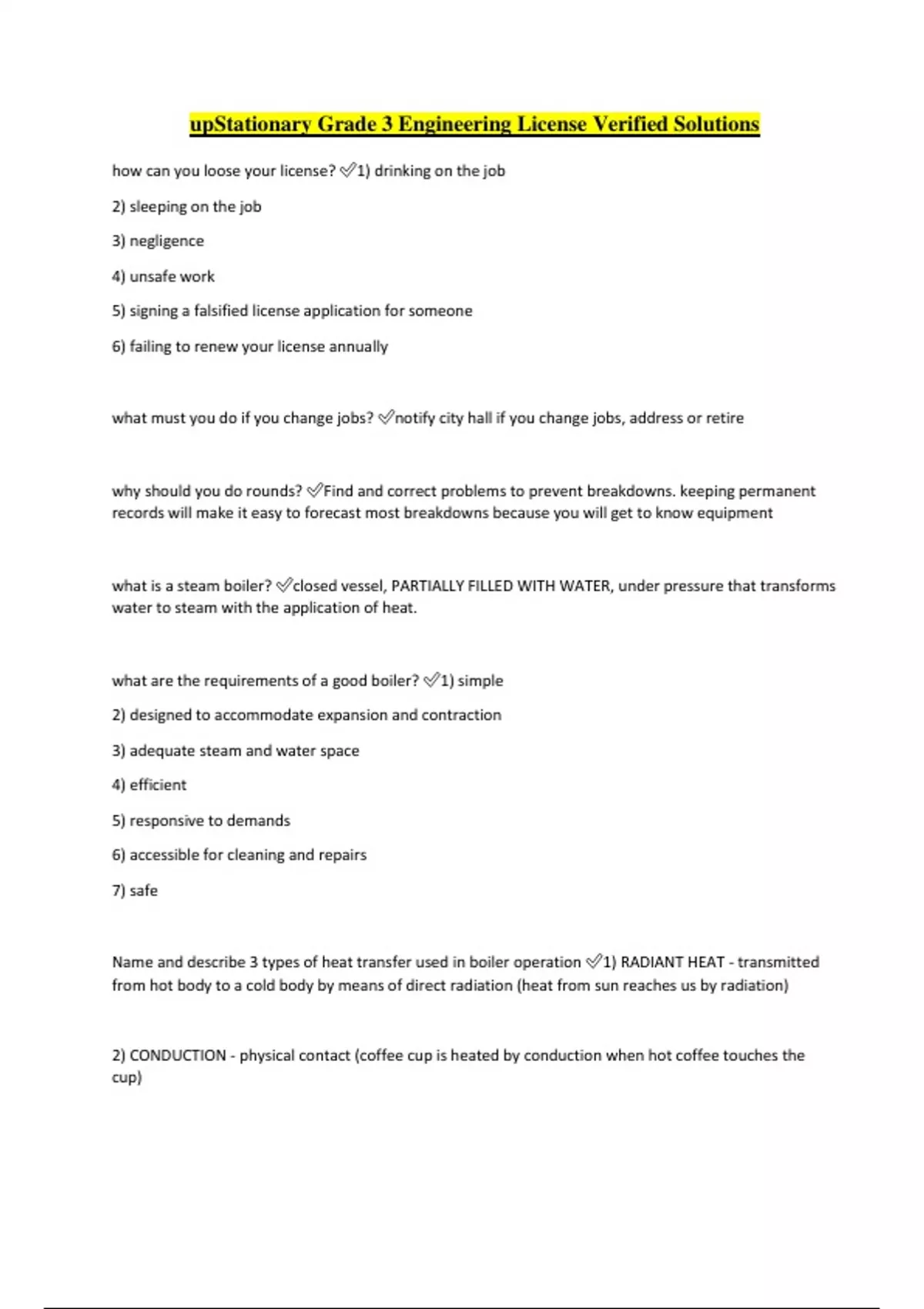 upStationary Grade 3 Engineering License Verified Solutions how can you loose your license? 1) drinking on the job 2) sleeping on the job 3) negligence 4) unsafe work 5) signing a falsified license application for someone 6) failing to renew your license annually what must you do if you change jobs? notify city hall if you change jobs, address or retire why should you do rounds? Find and correct problems to prevent breakdowns. keeping permanent records will make it easy to forecast most breakdowns because you will get to know equipment what is a steam boiler? closed vessel, PARTIALLY FILLED WITH WATER, under pressure that transforms water to steam with the application of heat. what are the requirements of a good boiler? 1) simple 2) designed to accommodate expansion and contraction 3) adequate steam and water space 4) efficient 5) responsive to demands 6) accessible for cleaning and repairs 7) safe Name and describe 3 types of heat transfer used in boiler operation 1) RADIANT HEAT - transmitted from hot body to a cold body by means of direct radiation (heat from sun reaches us by radiation) 2) CONDUCTION - physical contact (coffee cup is heated by conduction when hot coffee touches the cup) 3) CONVECTION - carried along by a moving part such as air or water (your living room is heated by warm air from your furnace in another location what is a combustion chamber? the area of the boiler where COMPLETE burning of the fuel occurs what is an internally fired boiler? ----- name 4 types those in which the grate and combustion chamber are enclosed within the boiler shell. ----- 1) Scotch marine 2) Vertical firetube 3) Locomotive 4) Cast iron package boiler what is an externally fired boiler ----- name 4 types the setting, including the furnace and grates is separate and distinct from the boiler shell. ----- 1) horizontal return tubular (HRT) set in brick 2) some watertube 3) cast iron set in brick 4) Stirling boiler 5) Heine boiler what is a crown sheet and its purpose? ----- what is a tube sheet and its purpose? in a vertical firetube boiler holds the tubes and is thicker